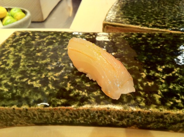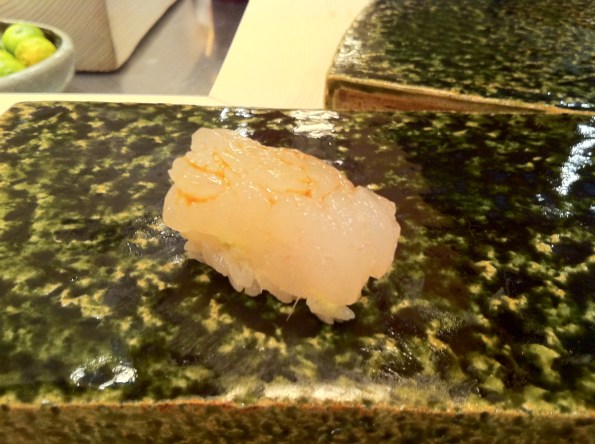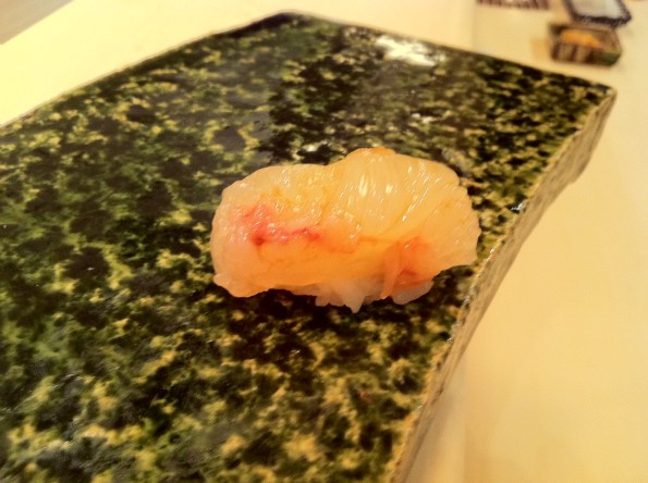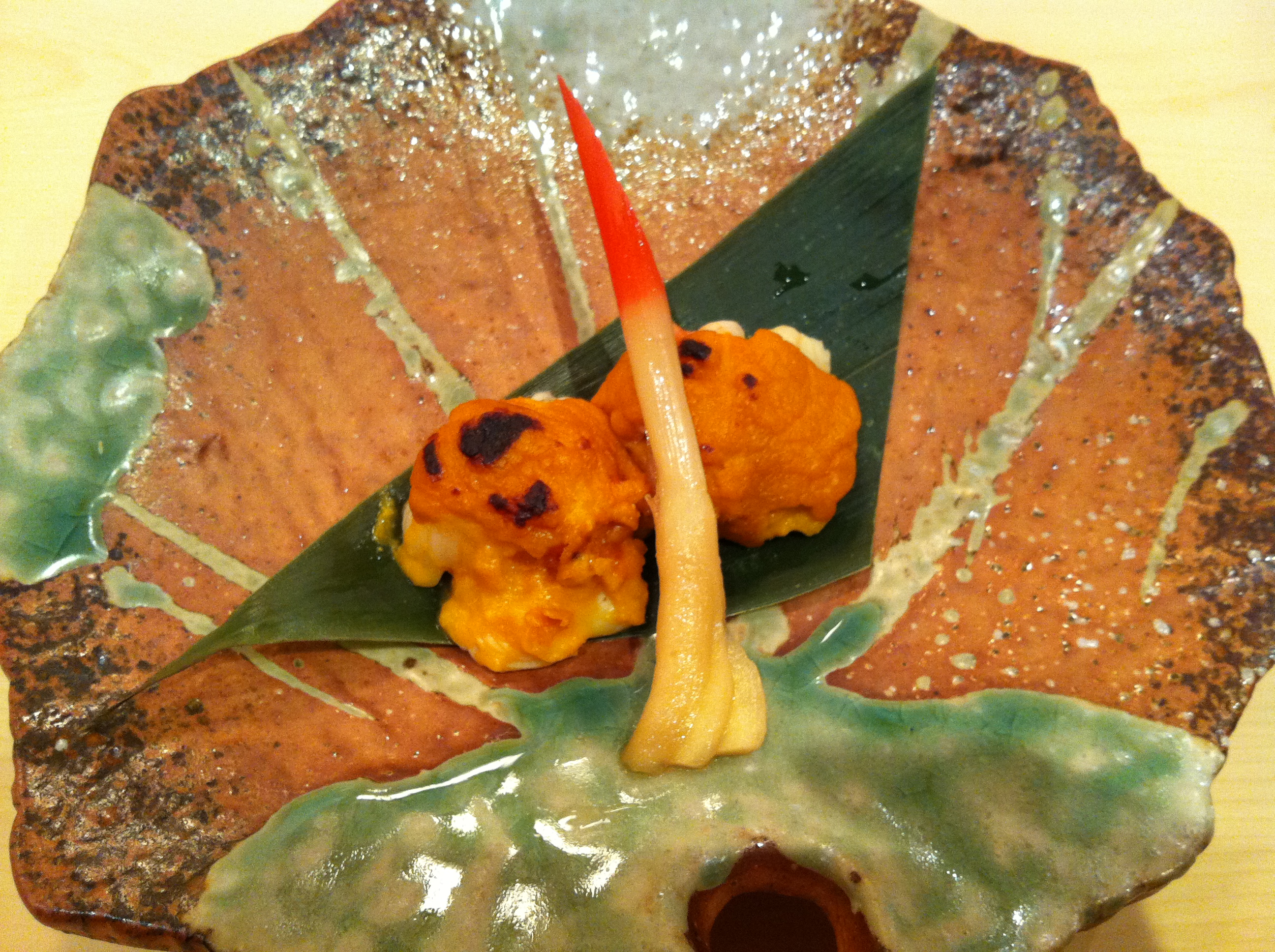 Refer to Course #4 in the 2nd Urasawa post for a similar picture. You can also see other people eating the course in the following picture (to give you a rough idea of how it looked like):