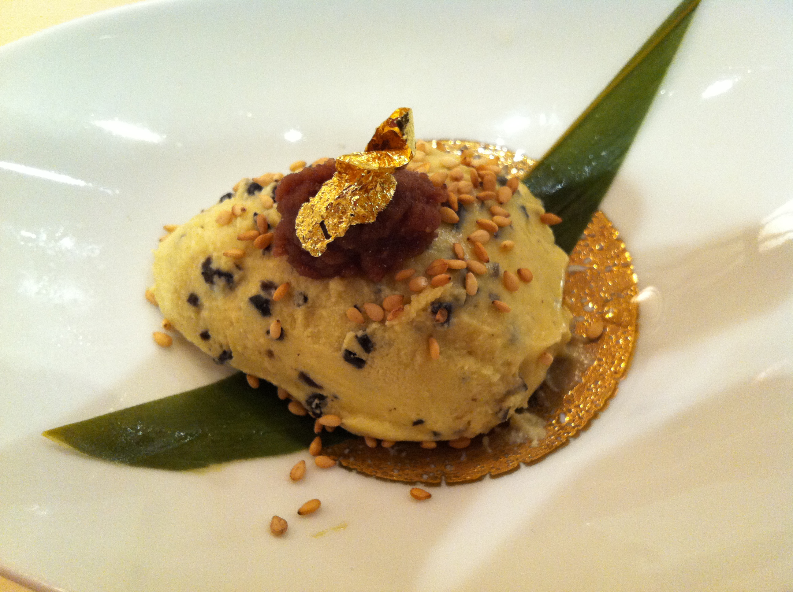 Sesame ice cream with red bean and 23-carat gold on top.