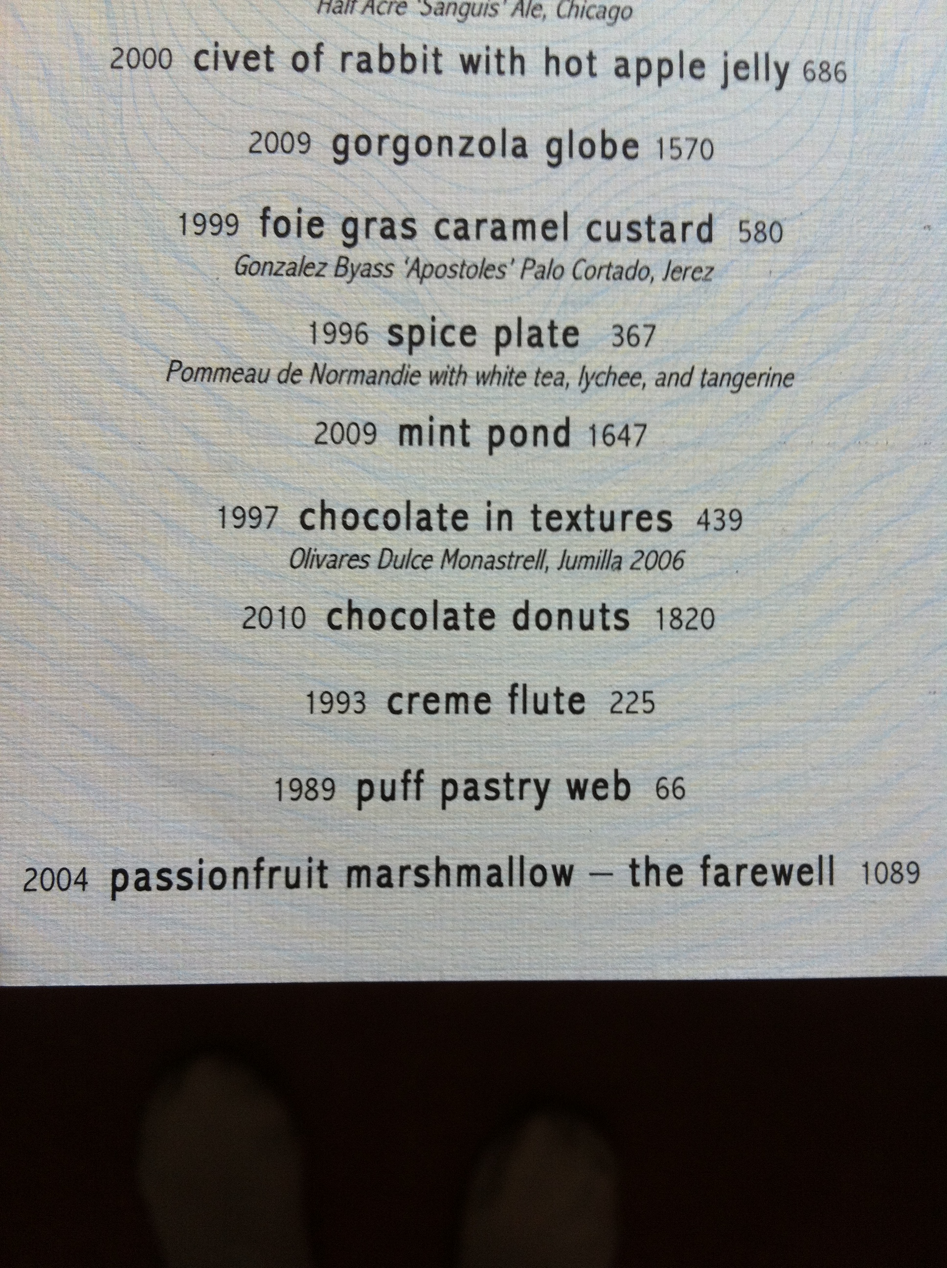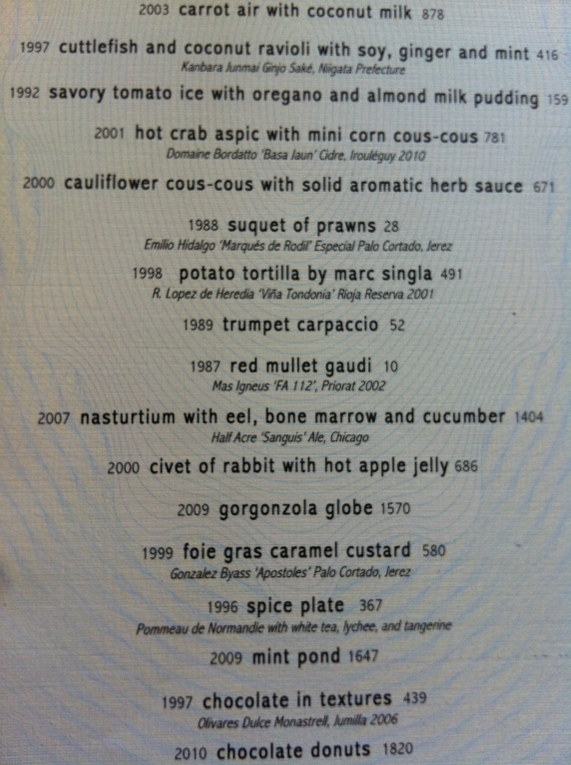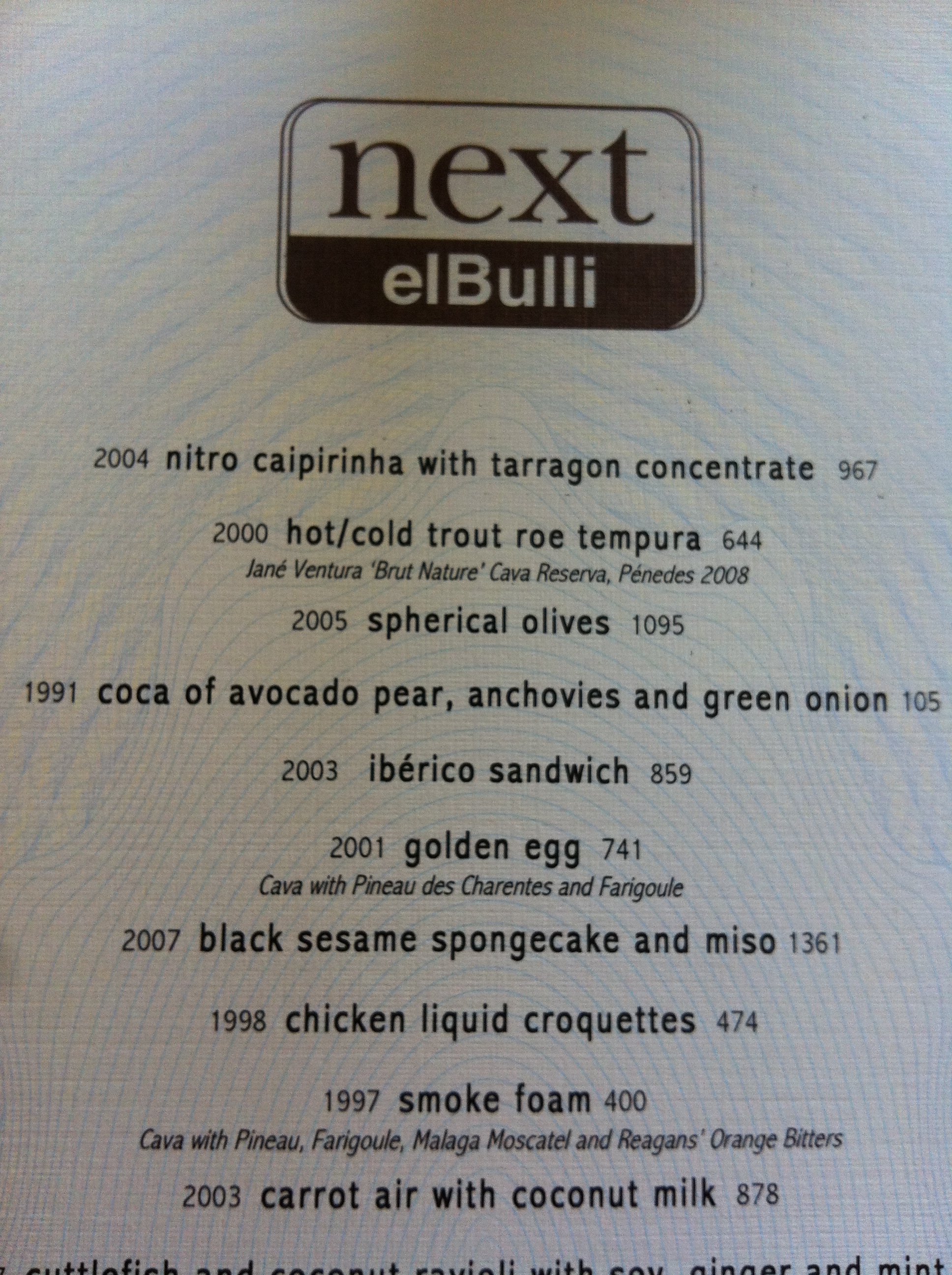 -Each course has a number to the right of it, and that number signifies when Adrià created it. For instance, course #100 means that it was Adrià’s 100th creation.