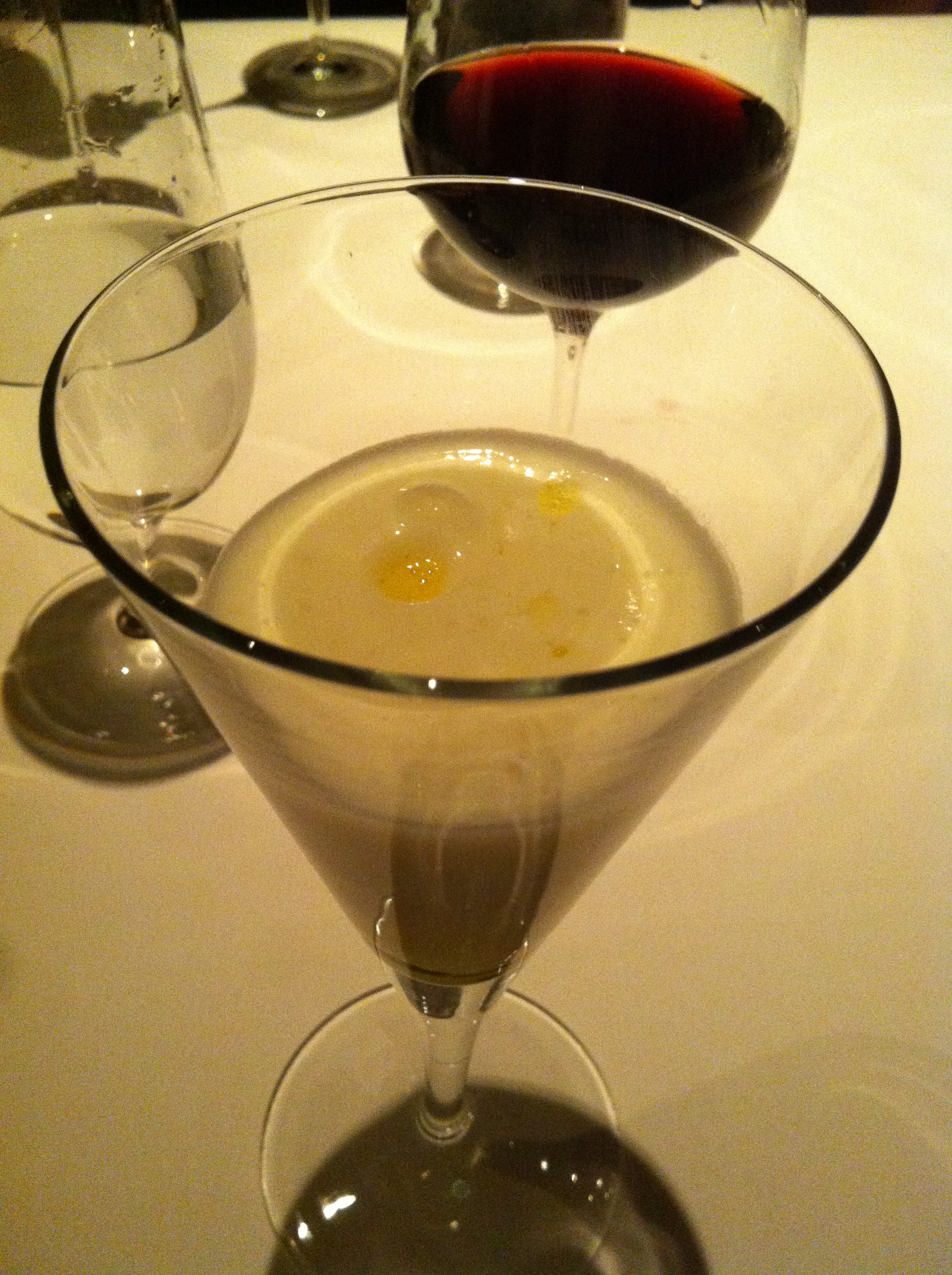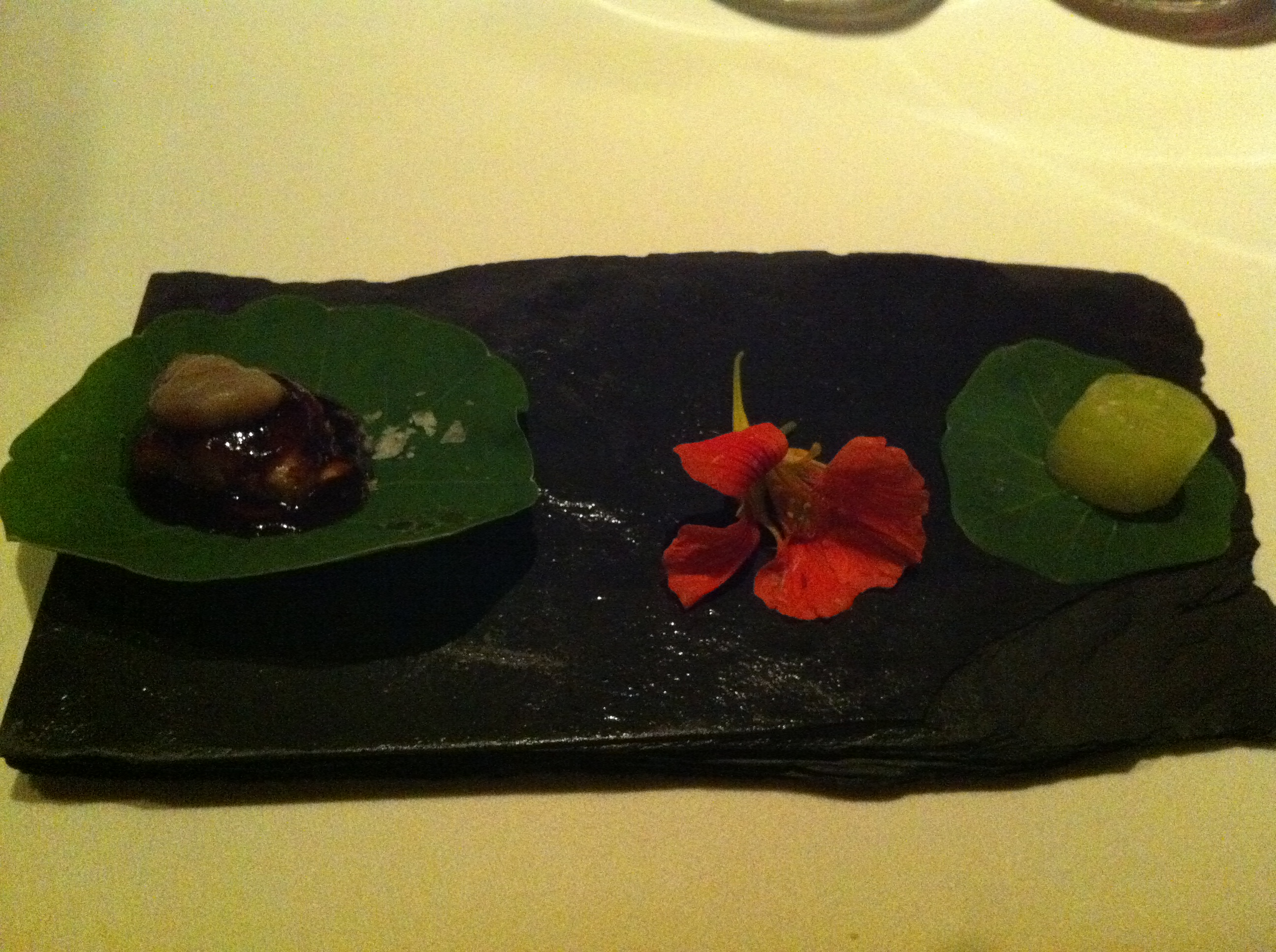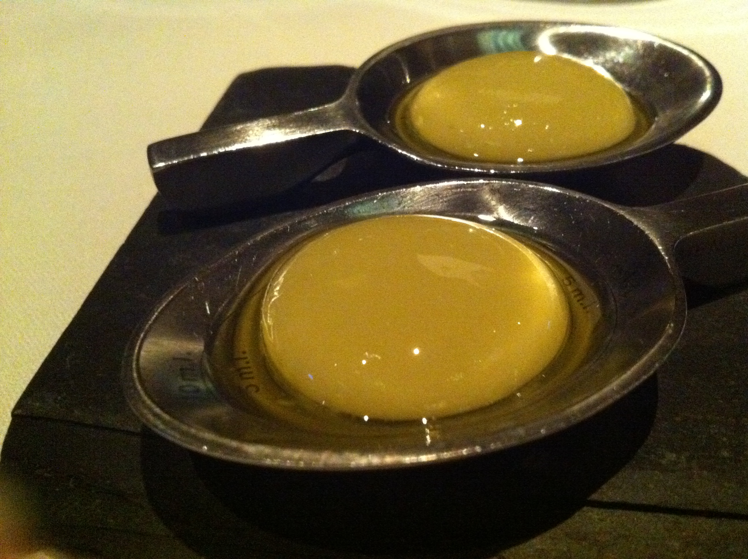 This was actually my first time trying spherical olives. I’ve tried spherification before (grapes and a few other fruits at Melisse), but it was my first time trying spherical olives. The server described it as “all the good parts of an olive without any of the bad parts”.