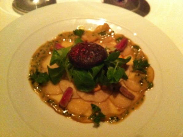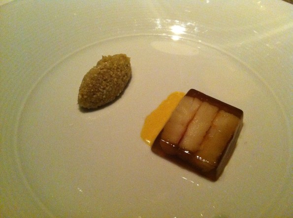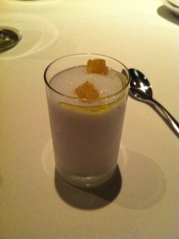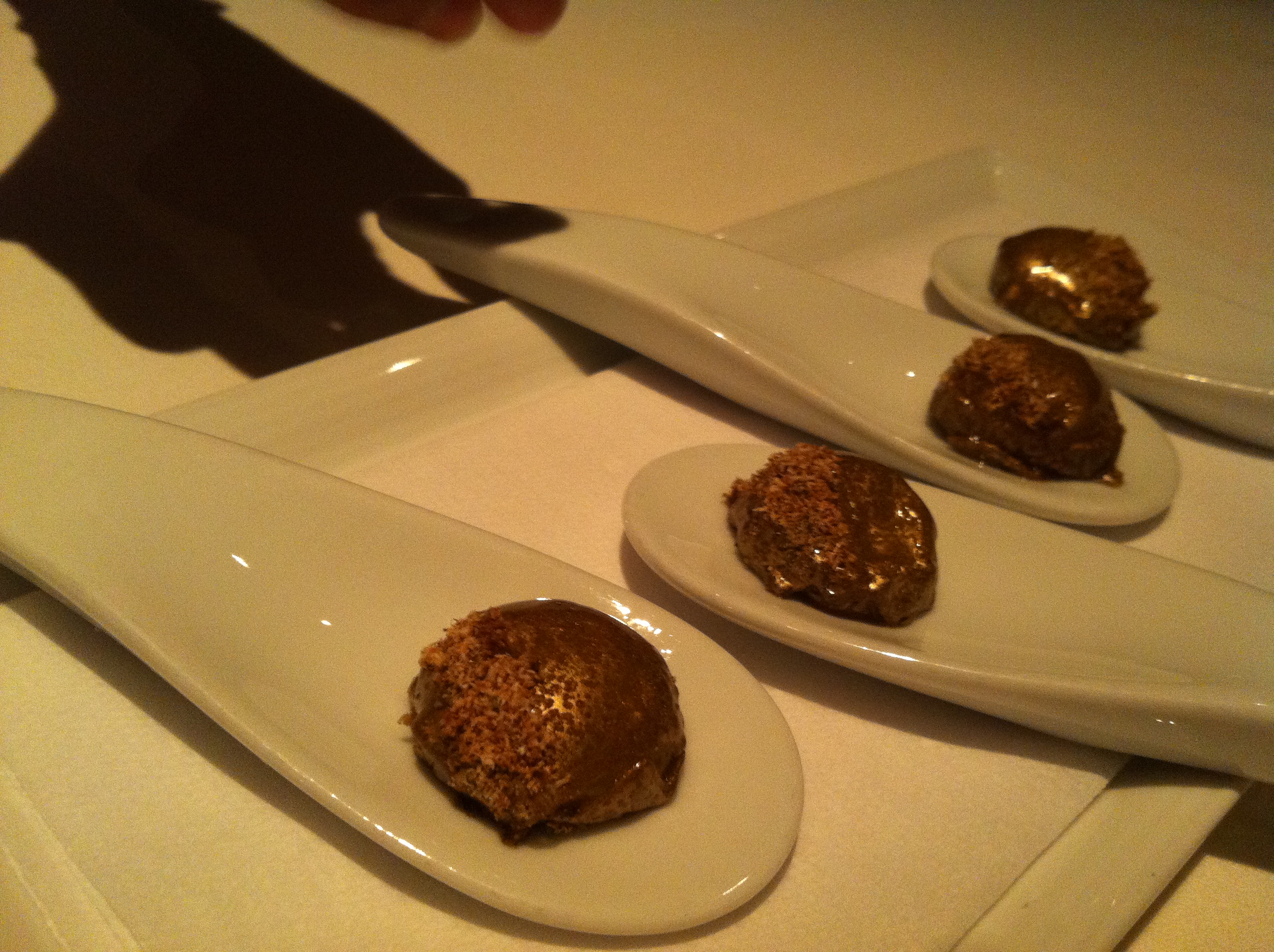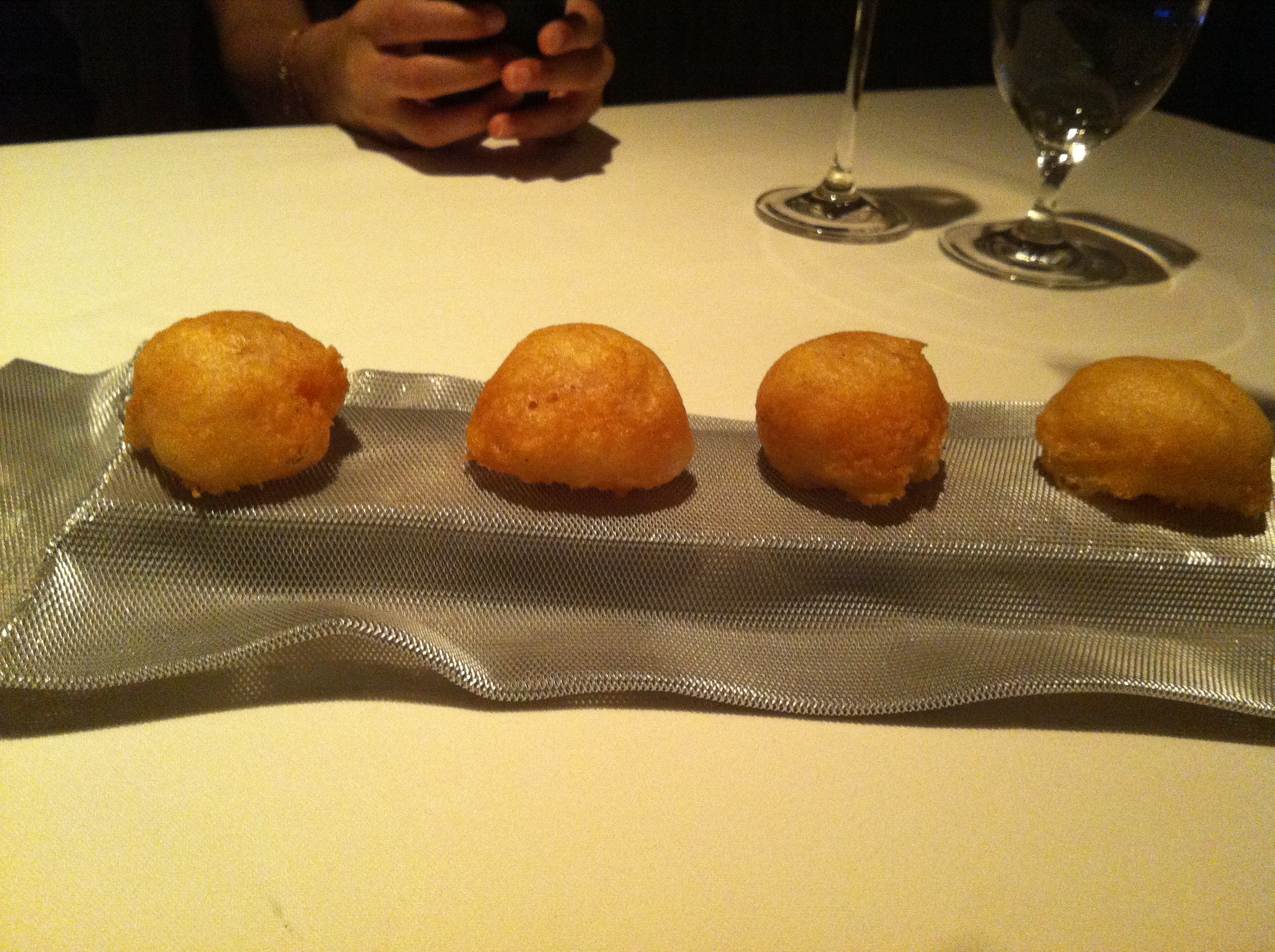 This was actually my first time trying spherical olives. I’ve tried spherification before (grapes and a few other fruits at Melisse), but it was my first time trying spherical olives. The server described it as “all the good parts of an olive without any of the bad parts”.