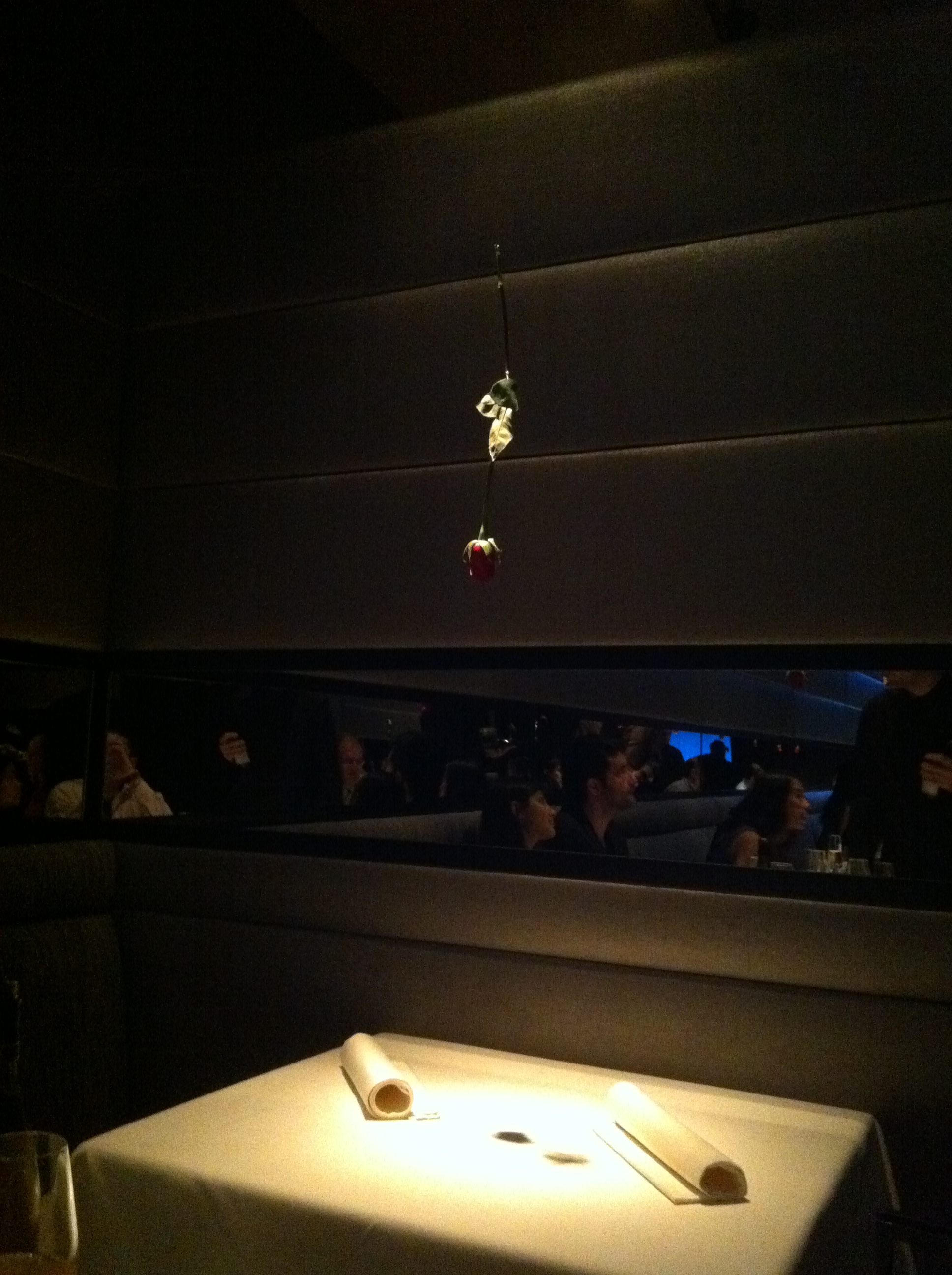 There was a single rose hanging upside-down over each table in tribute to the single red roses that were always on the tables at El Bulli.