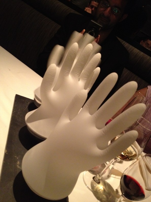 The hand is waving goodbye, and there’s a passion-fruit marshmallow inside each glove. This is basically one last surprise in the meal.