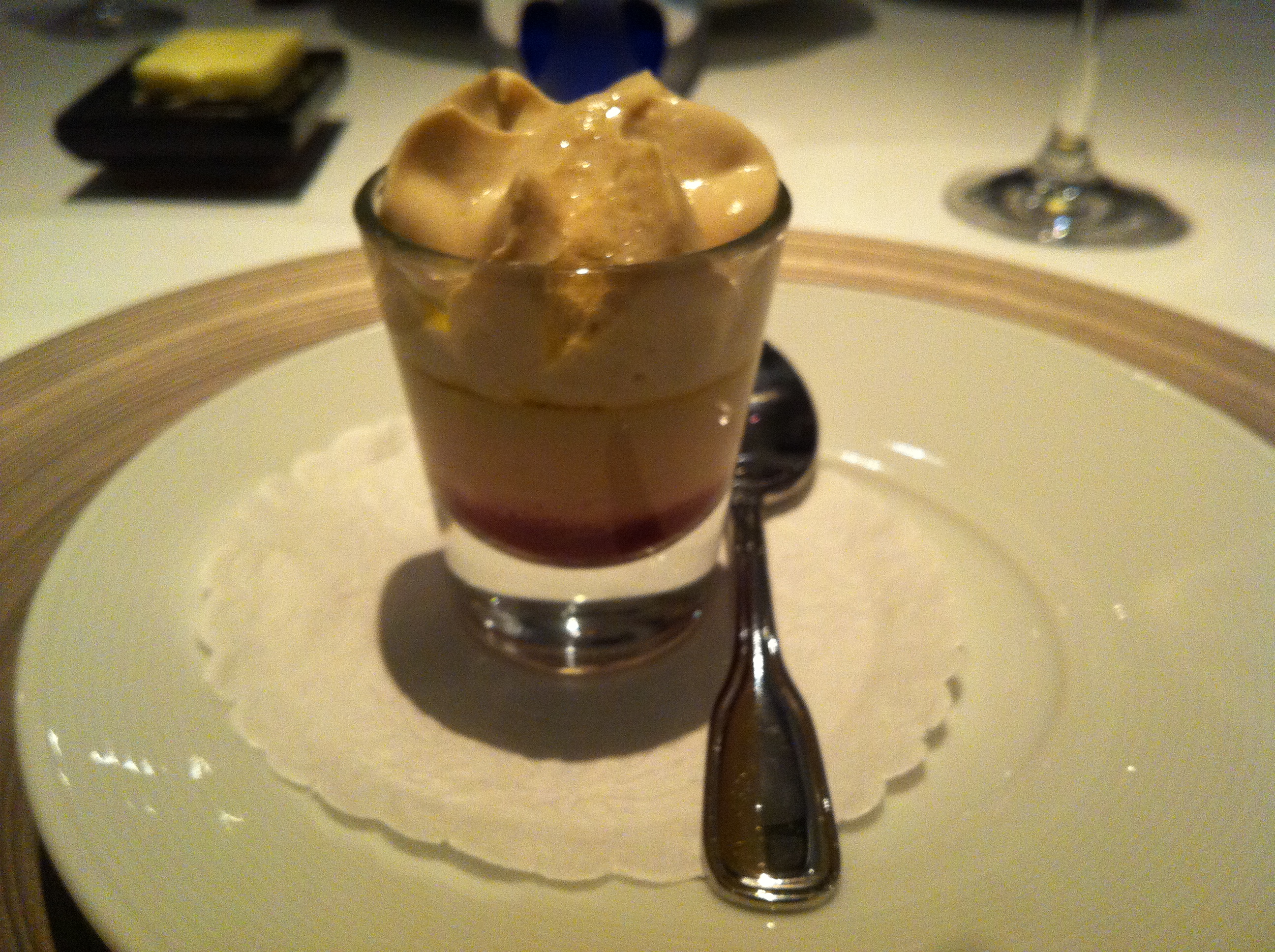 Foie gras flan, blood orange gelée, and toasted hazelnut foam with vanilla oil.