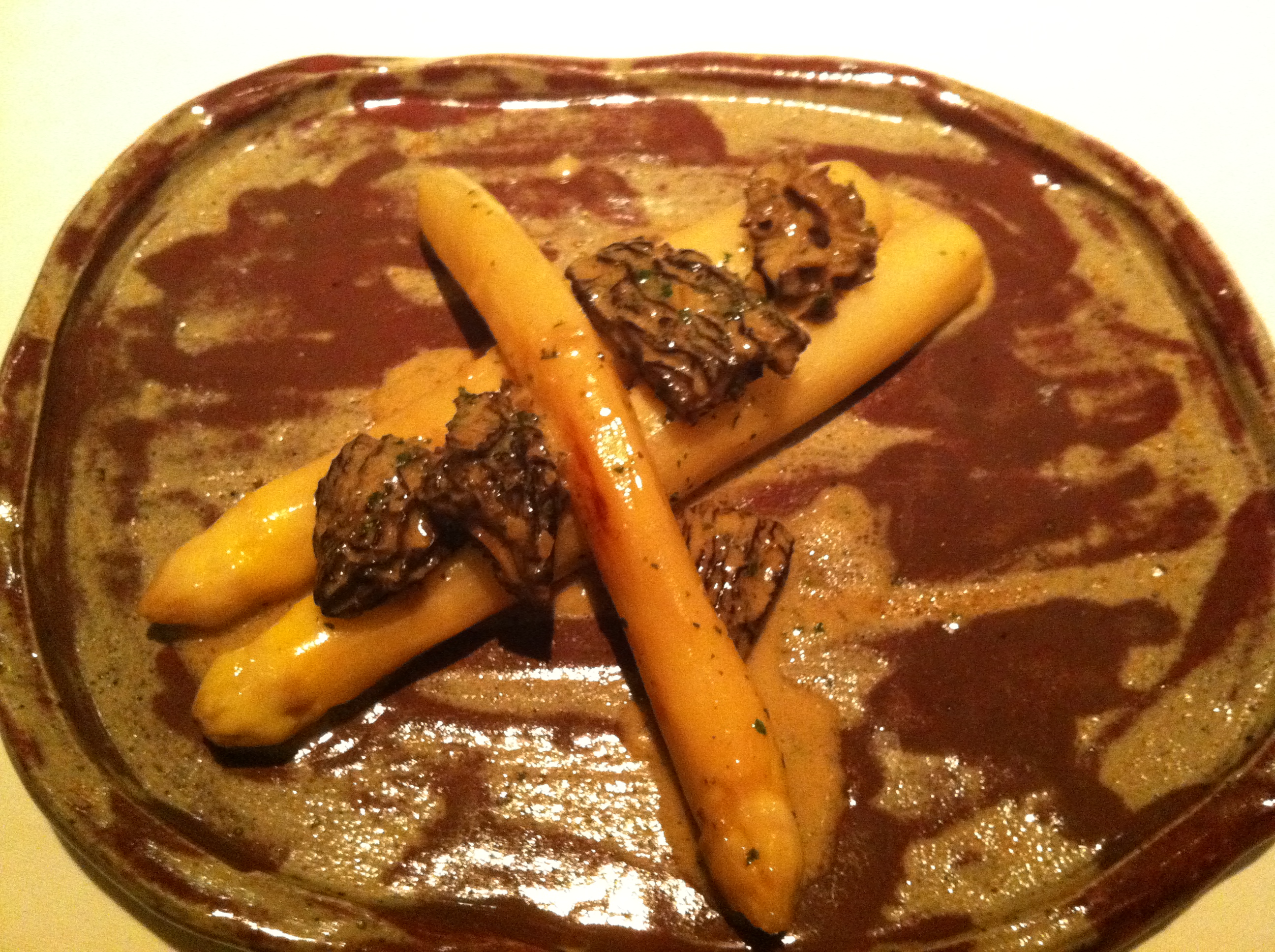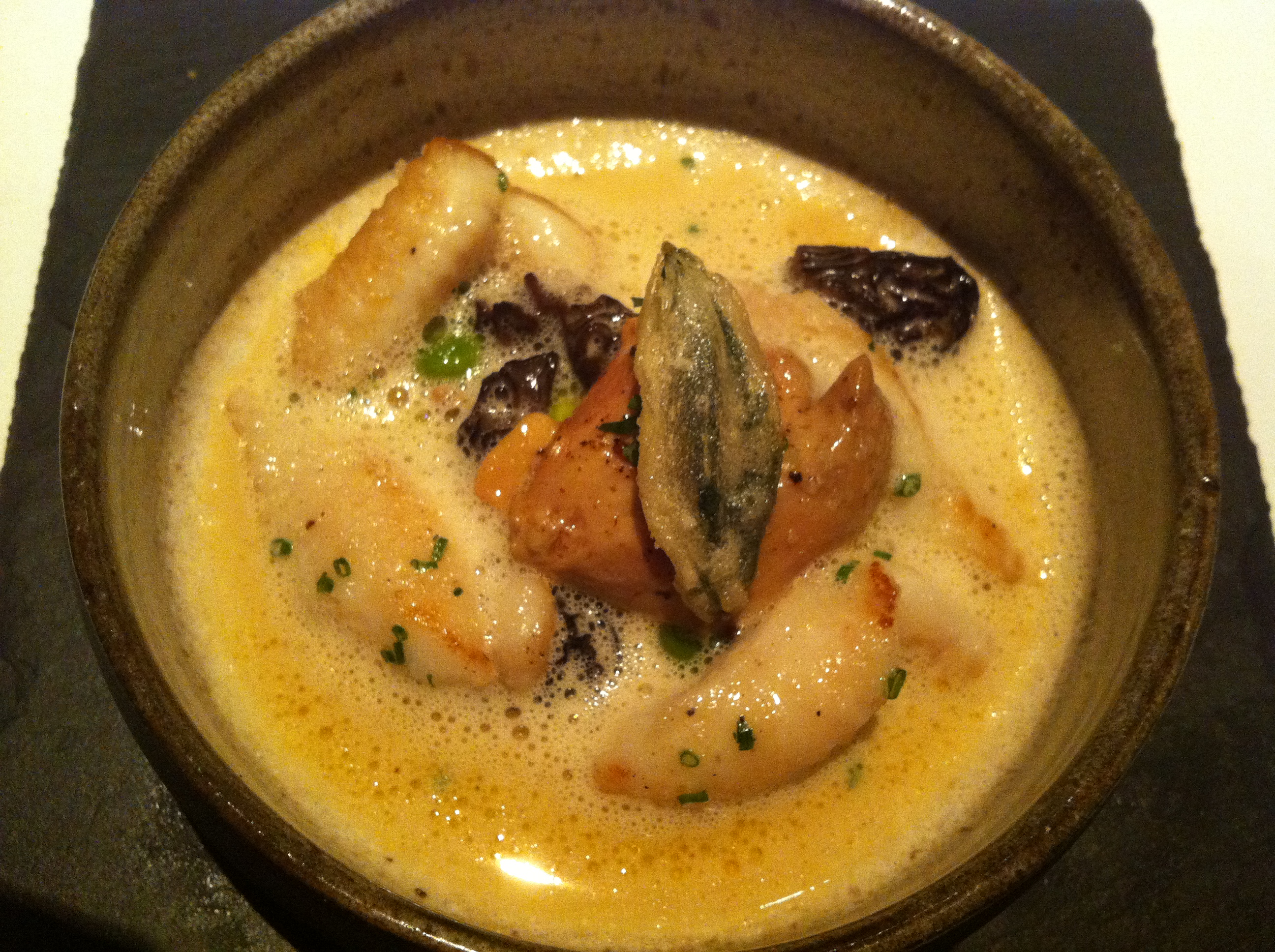 with fava beans, fava leaf, Vidalia onions, morels, and sea kelp foam.