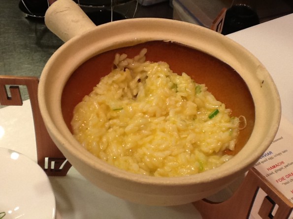 They gave us a big bowl of this stuff! I didn’t finish it, though. It was super rich, and I felt guilty about eating it (fat from the chicken stock and empty carbs from the white rice—BAD).