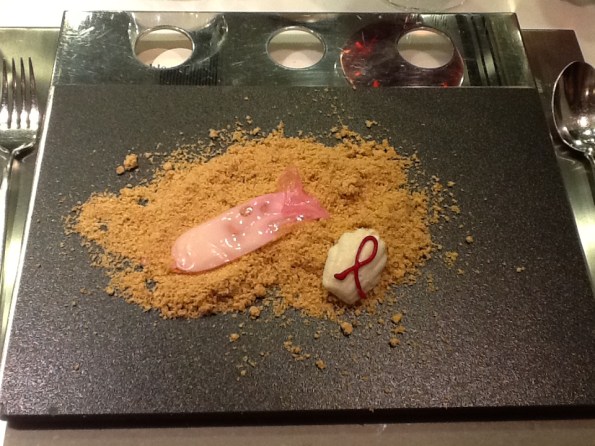 “This unique dish features a sweet edible condom, made by dipping a cigar tube into a kappa and konjac mixture. Using a pipette, Alvin then squeezed a few drops of a honey and Yunnan ham mixture. The ‘condom’ was then placed onto powdered shiitake mushrooms, made to look like sand. . . . Though many might find this dish distasteful, Alvin says it’s all for a good cause aiming to raise awareness of HIV/AIDS. Priced at HK$68, this dish will go towards AIDS Concern in HK.”