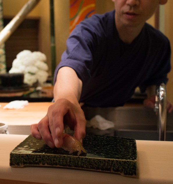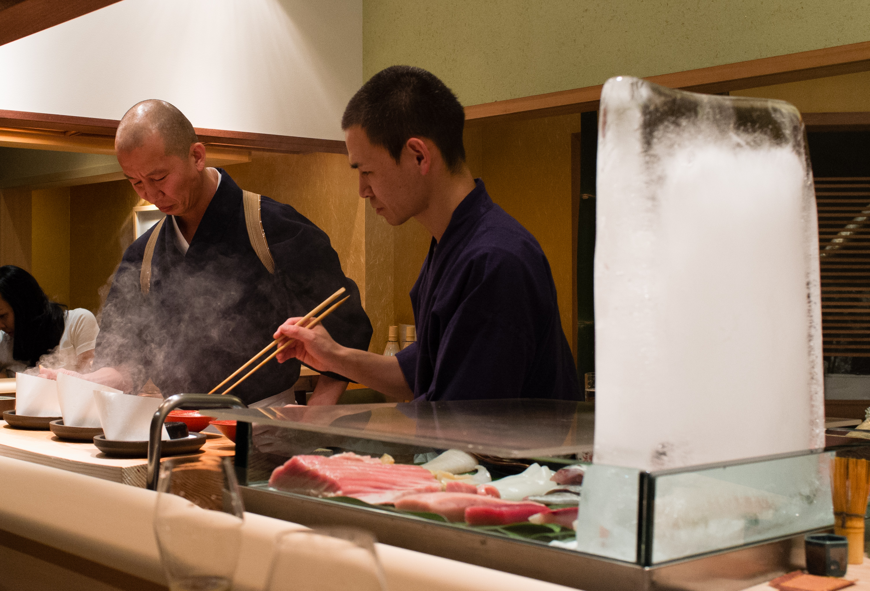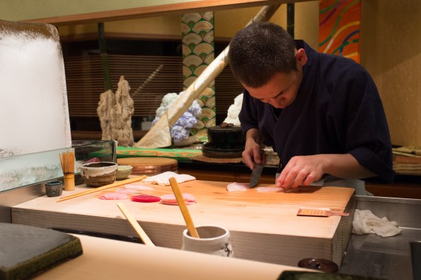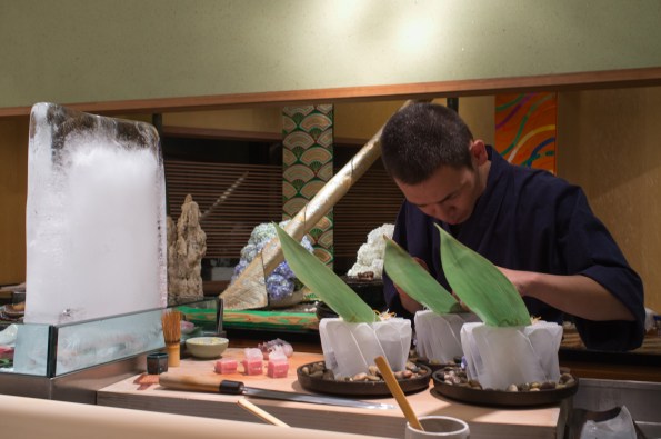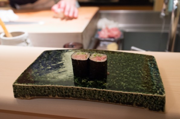 Ken’s preparing the next course (sushi roll with toro, daikon pickle, and scallion) here.