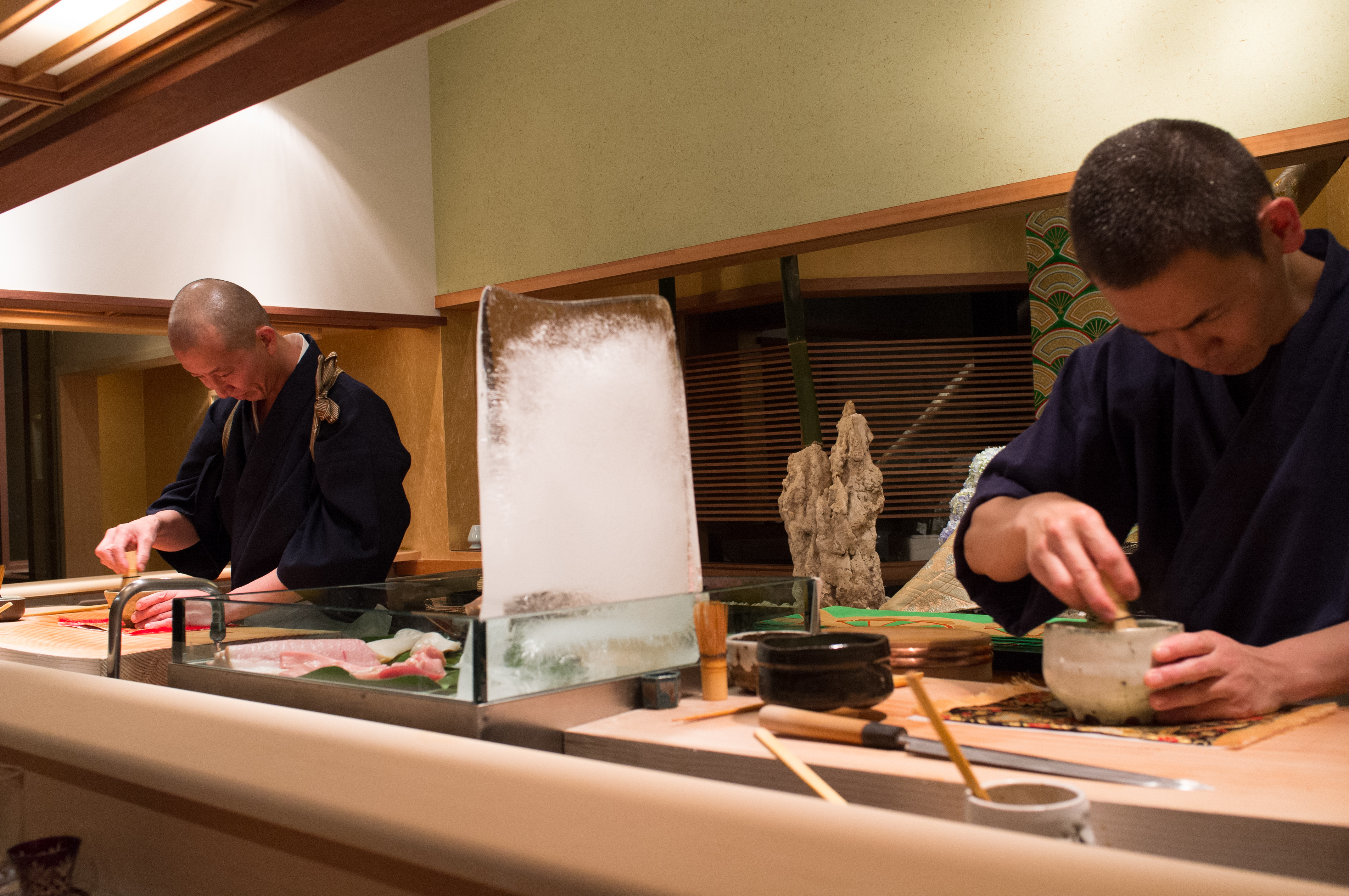 Hiro and Ken are preparing the matcha green tea for the next course here.