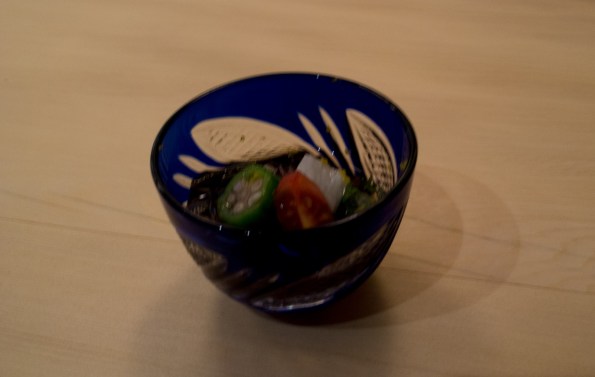 Tatsunae (the spelling’s wrong; I don’t know how to actually spell it) vegetables: okra, daikon pickle.