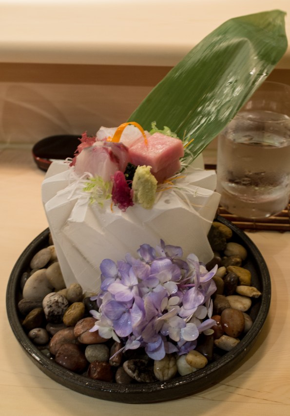 “Ice Block” course: skipjack, red snapper, and toro from Japan. Fresh wasabi. Seaweed. Daikon. Red ginger…???