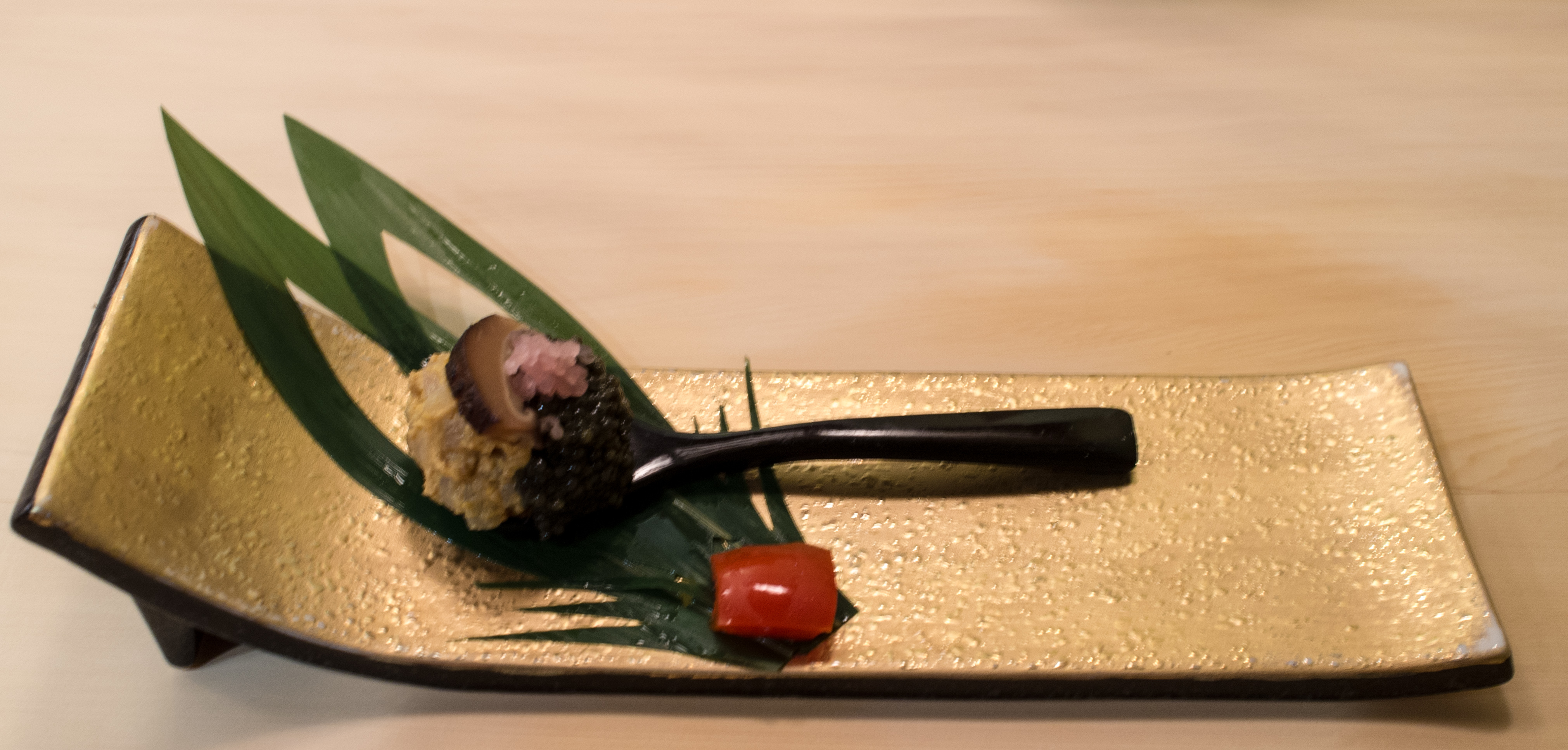 Russian caviar, monkfish and monkfish liver pate, shitake mushroom, and red turnip. Pickled bell pepper on the side.