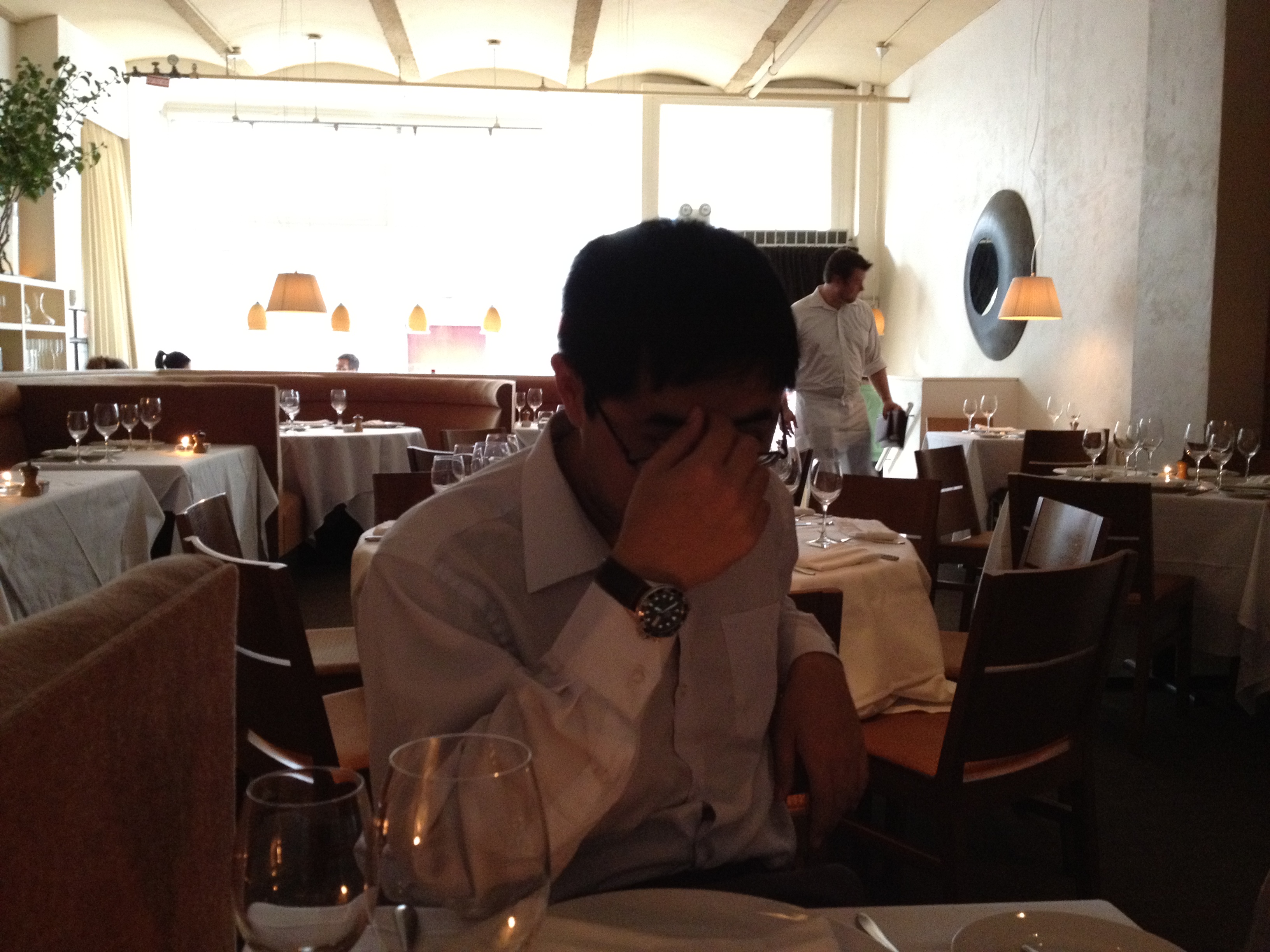 The restaurant is relatively small for a fine-dining restaurant; we sat at the far wall, and here’s a view of pretty much the entire restaurant. The entrance to the kitchen is in the left corner.