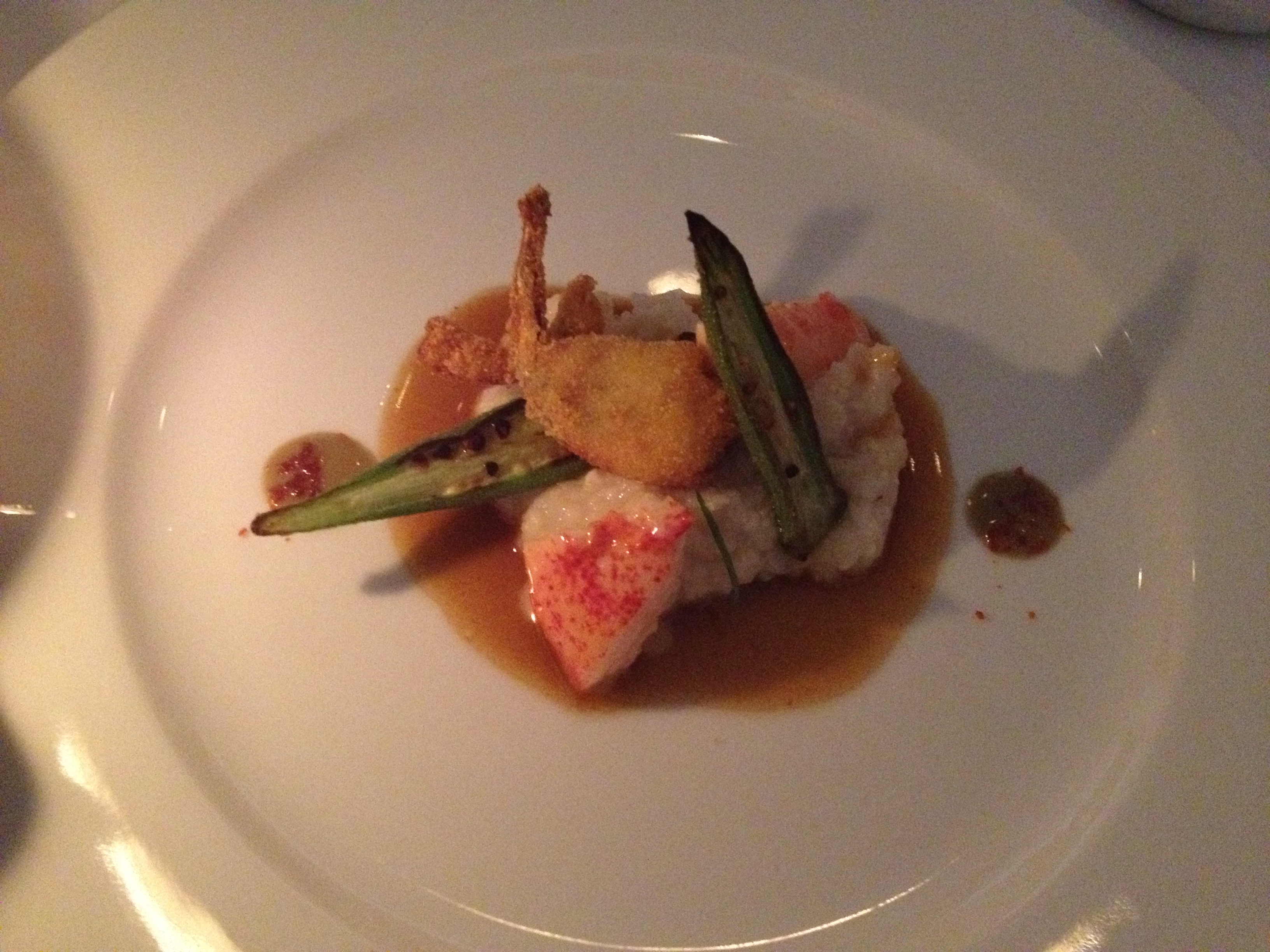 “Frog Legs and Lobster with White Speckled Grits and Seared Okra”