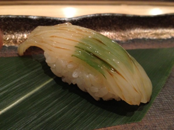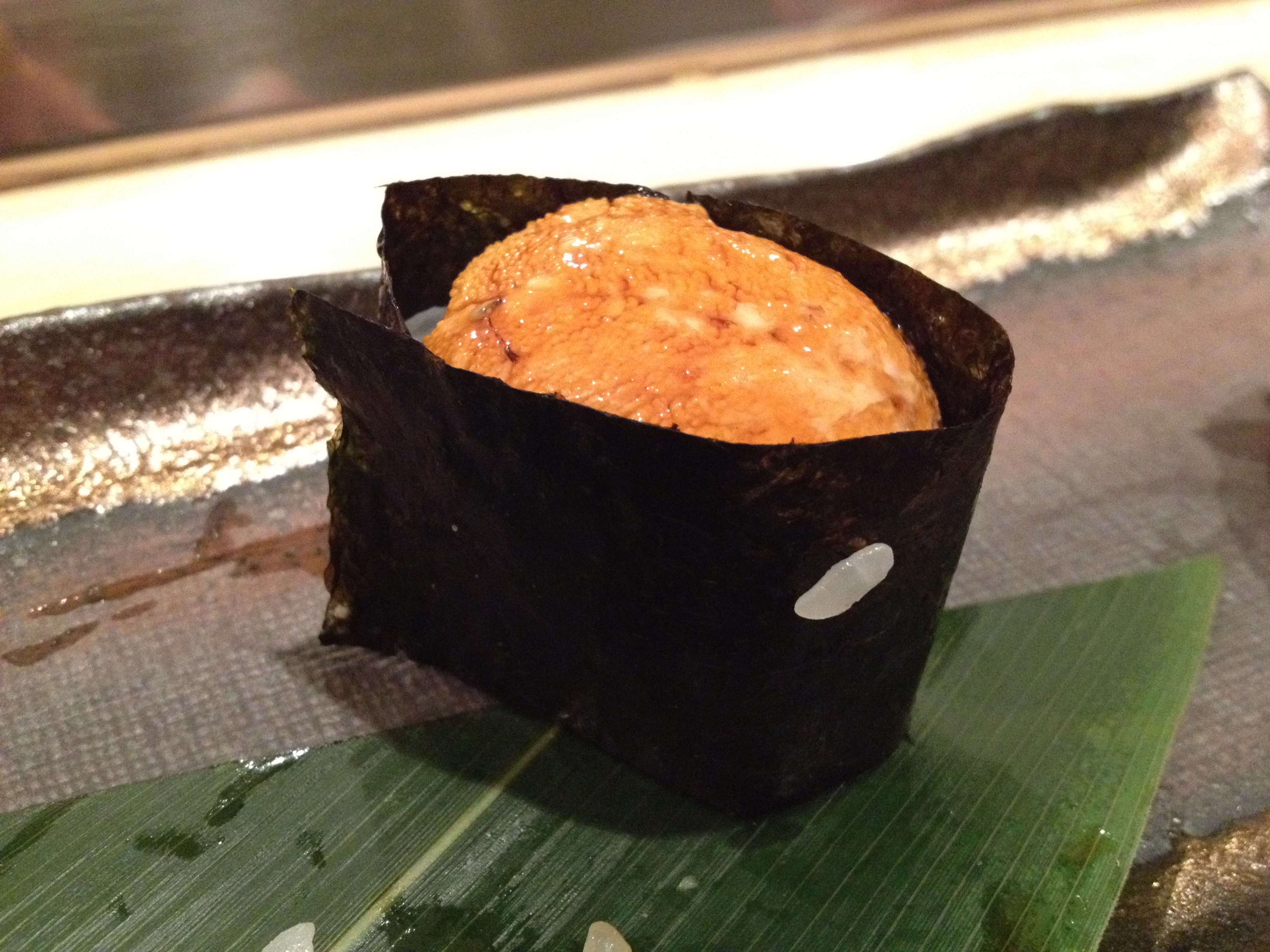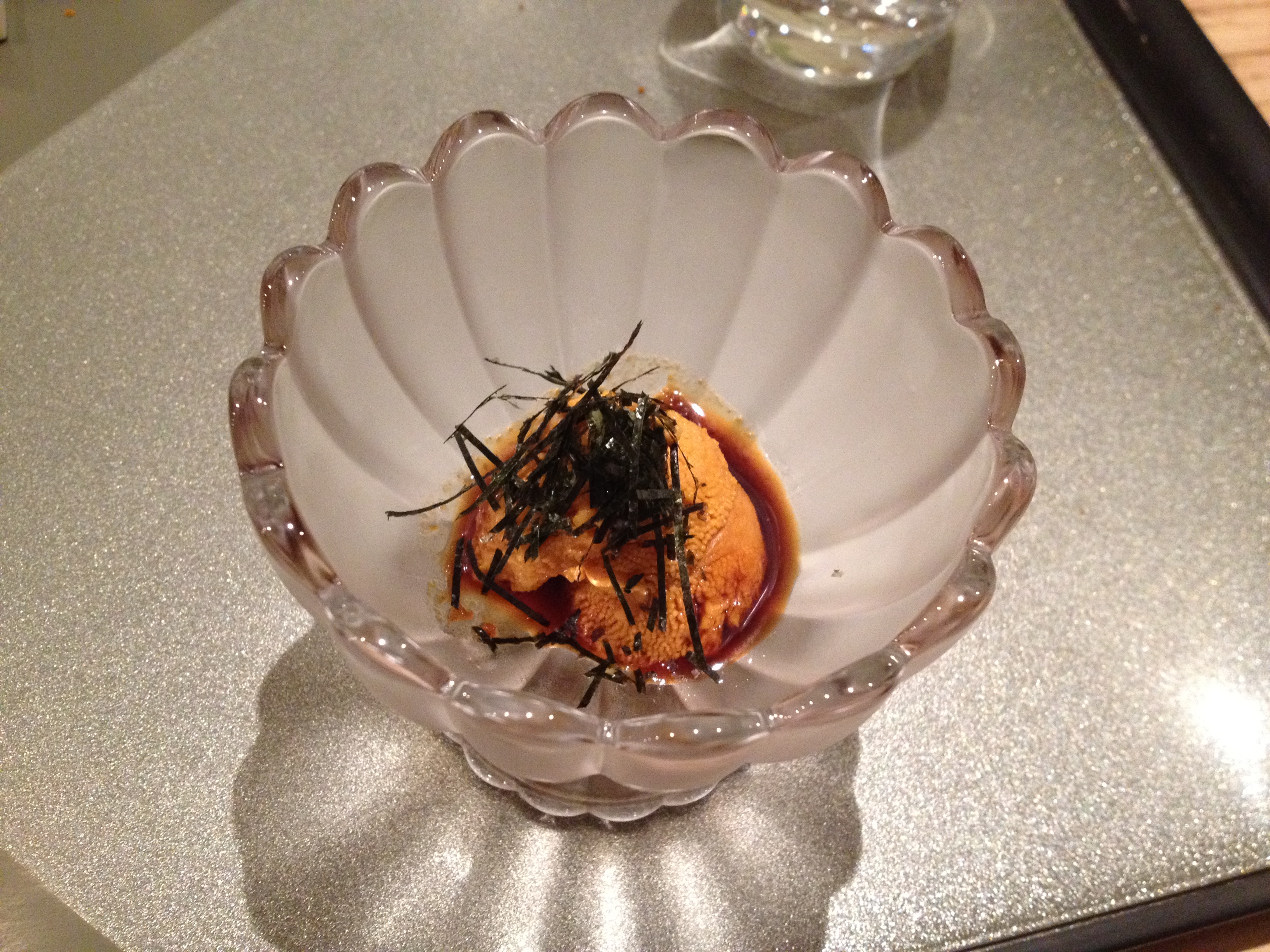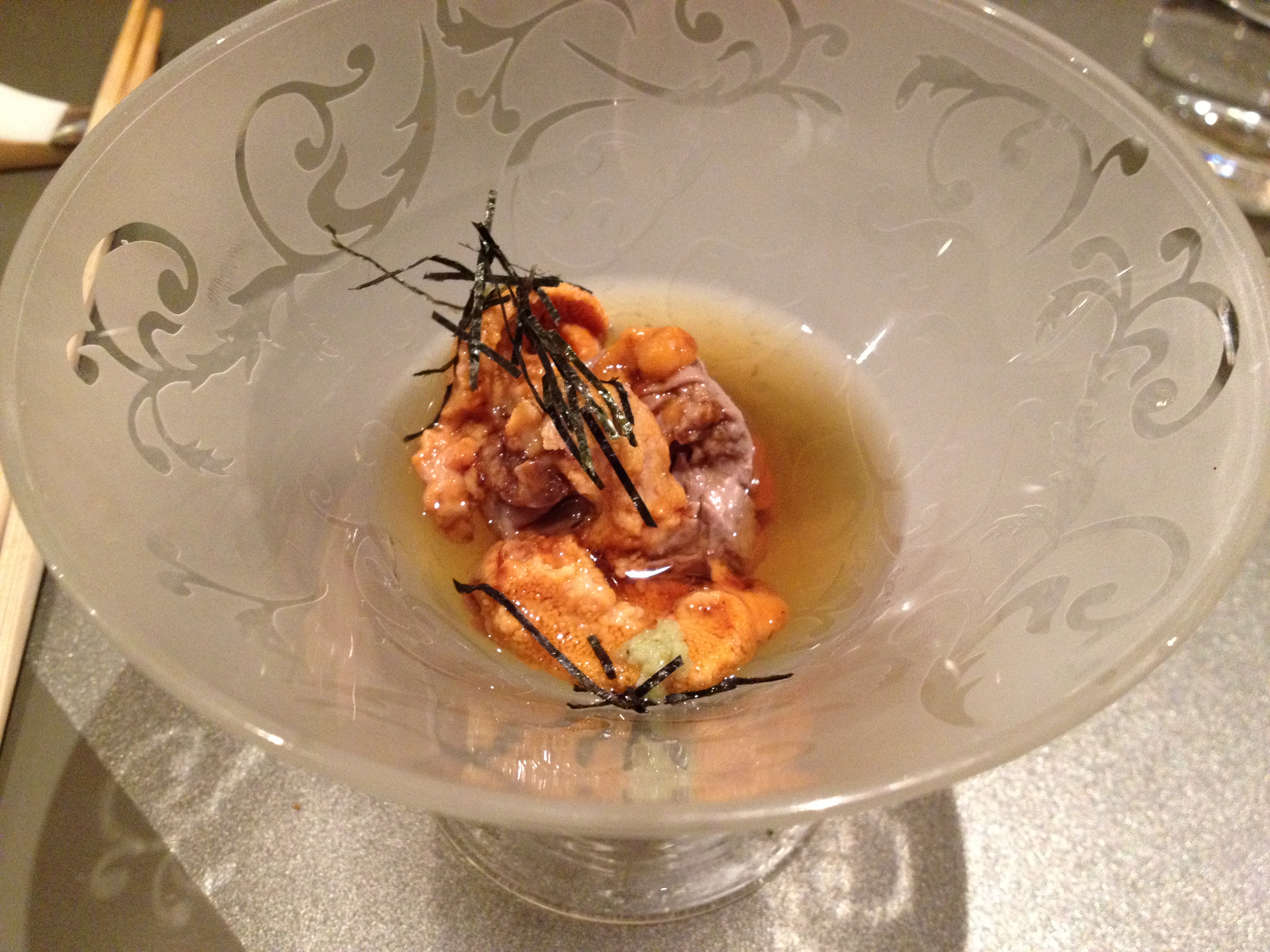 -Chef Kosugi was smiling at us while giving us this. A “reasonable person” might think that he was just trying to make our meal more memorable and enjoyable, but he CLEARLY was thinking something along the lines of, “I know you guys are sick of uni right now, but I’M GONNA GIVE YOU MORE! HAHAHA!” Well played, Chef. Well played.