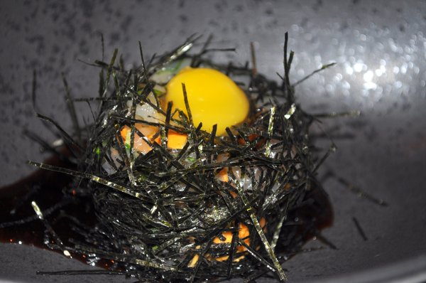 -served with quail egg and tosa soy reduction.
