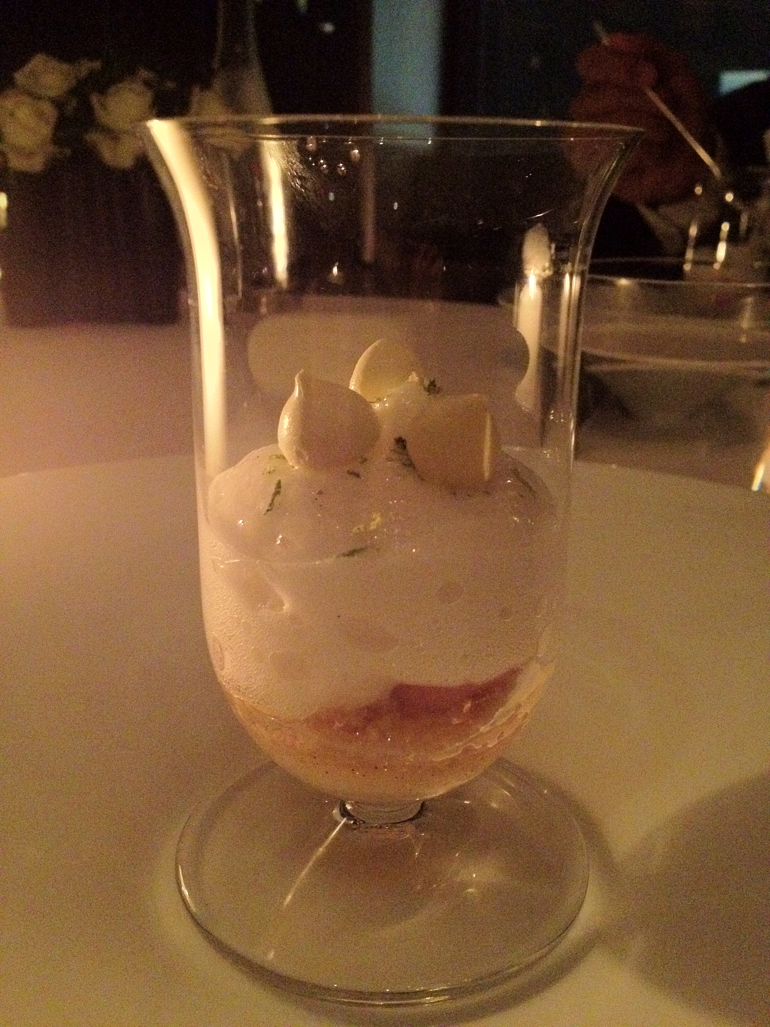 I asked Chris, our server, if I could get something new for my caviar dish, and the chef came up with this! It reminded me a lot of the Hass avocado sorbet I had during the 30-course Per Se meal. This one was very simple and delicious, and it definitely focused on taste more than complexity; the avocado mixed very well with the caviar, and it definitely was a new combination that I hadn’t encountered before. Still, I think I appreciated the other Hass avocado sorbet dish more. It was more complex, and I liked that more. (In terms of creativity, I think both dishes were really creative.) For reference, the other dish was “HASS AVOCADO SORBET” (“Ajo Blanco,” Picholine Olive, and Nasturtium Capers).
