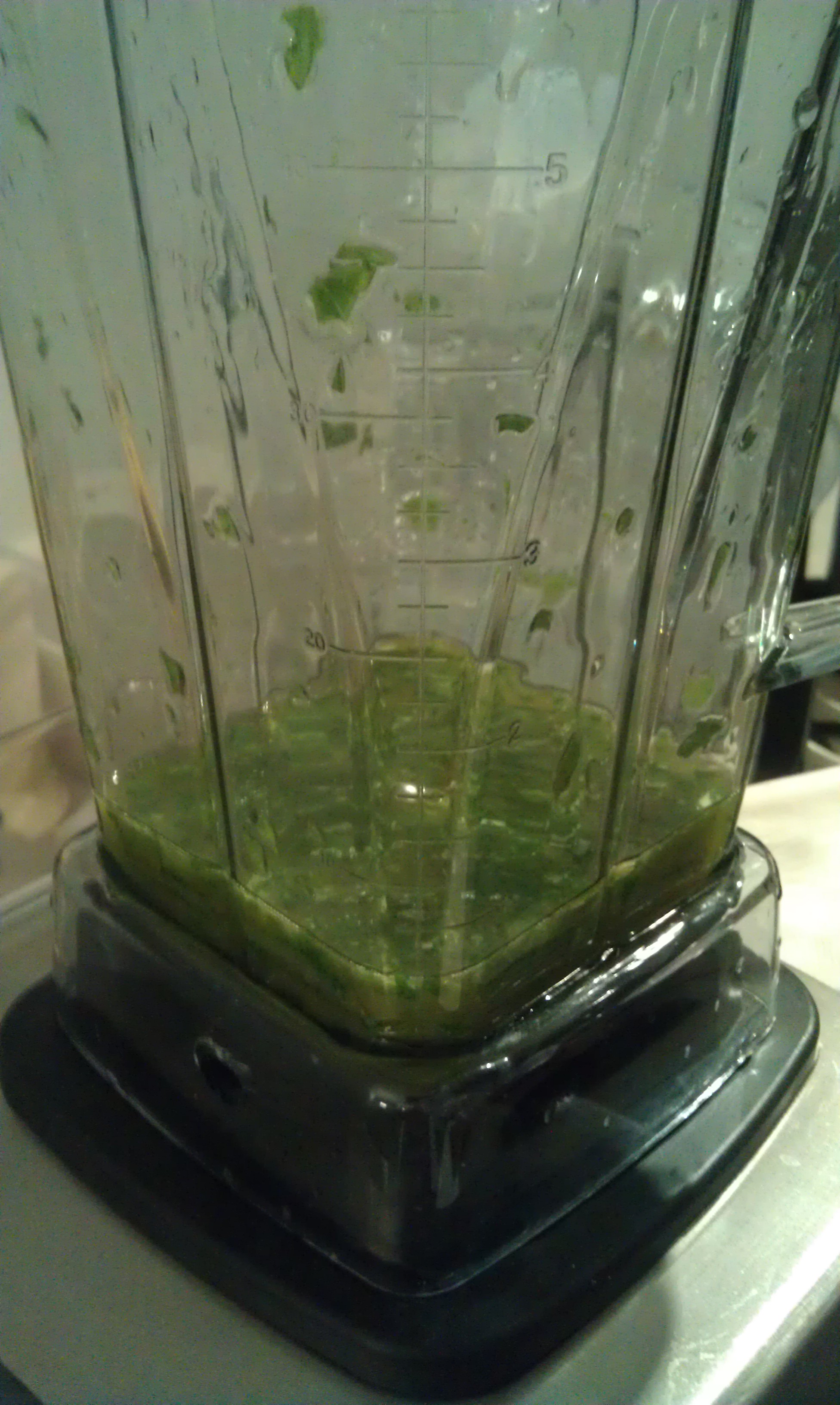 I blended the basil with 3/4 cup of olive oil until it was thinly shredded.