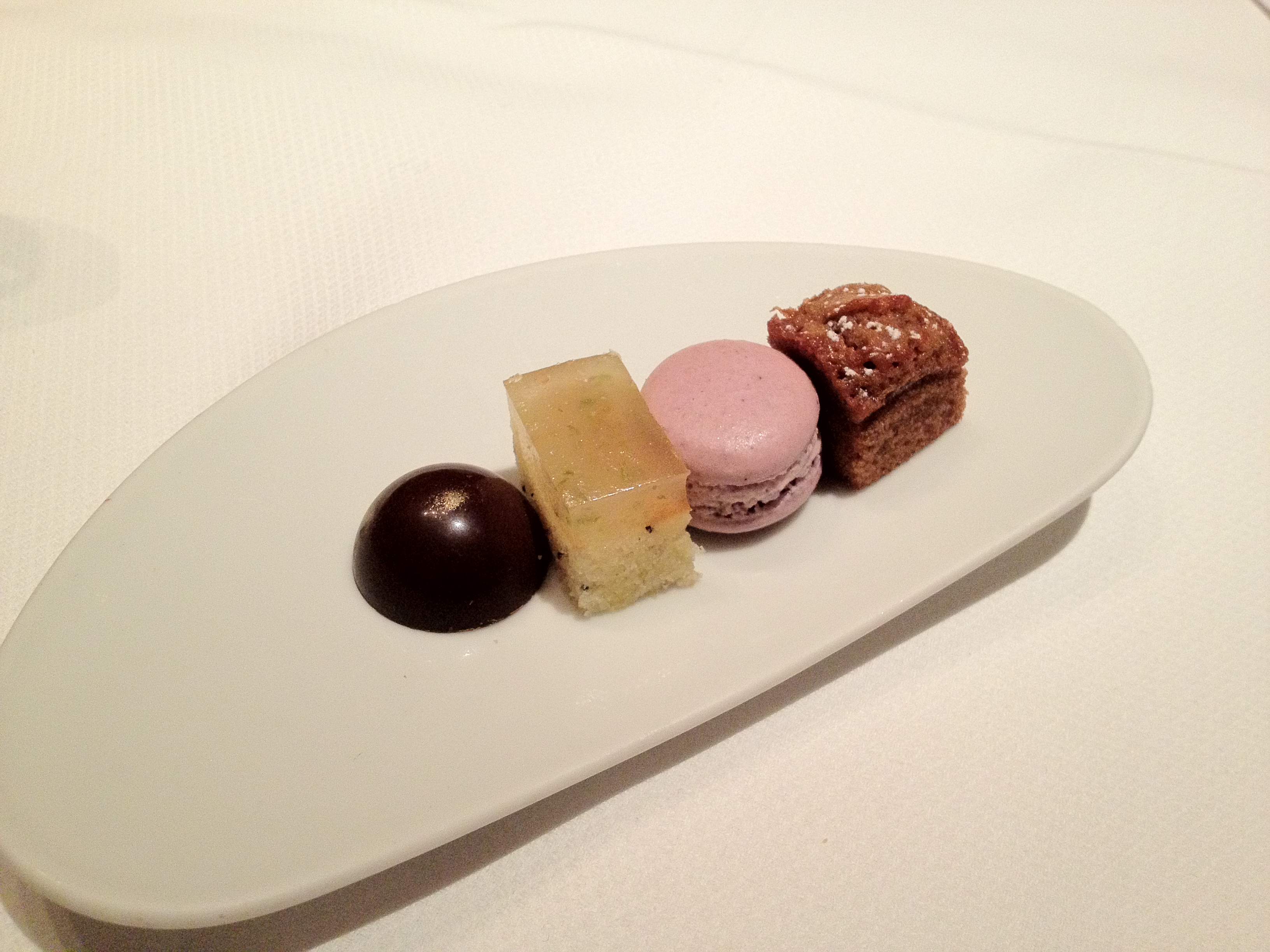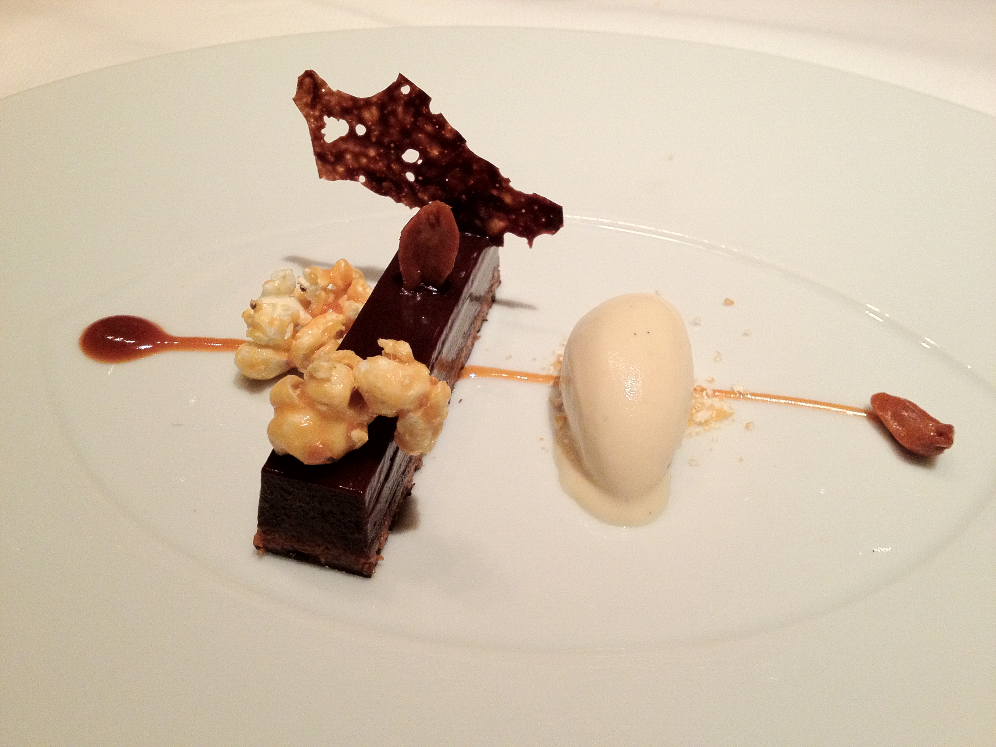 This dessert reminded me of a Kit Kat–like dessert I had at Per Se once. The Madagascan chocolate was very strong (in a good way), but the popcorn ice cream helped balance out the chocolate (though it was sweet in its own right). The popcorn pieces were crisp and sweet, though they didn’t ruin the chocolate or ice cream; they just added a new layer of complexity and texture.