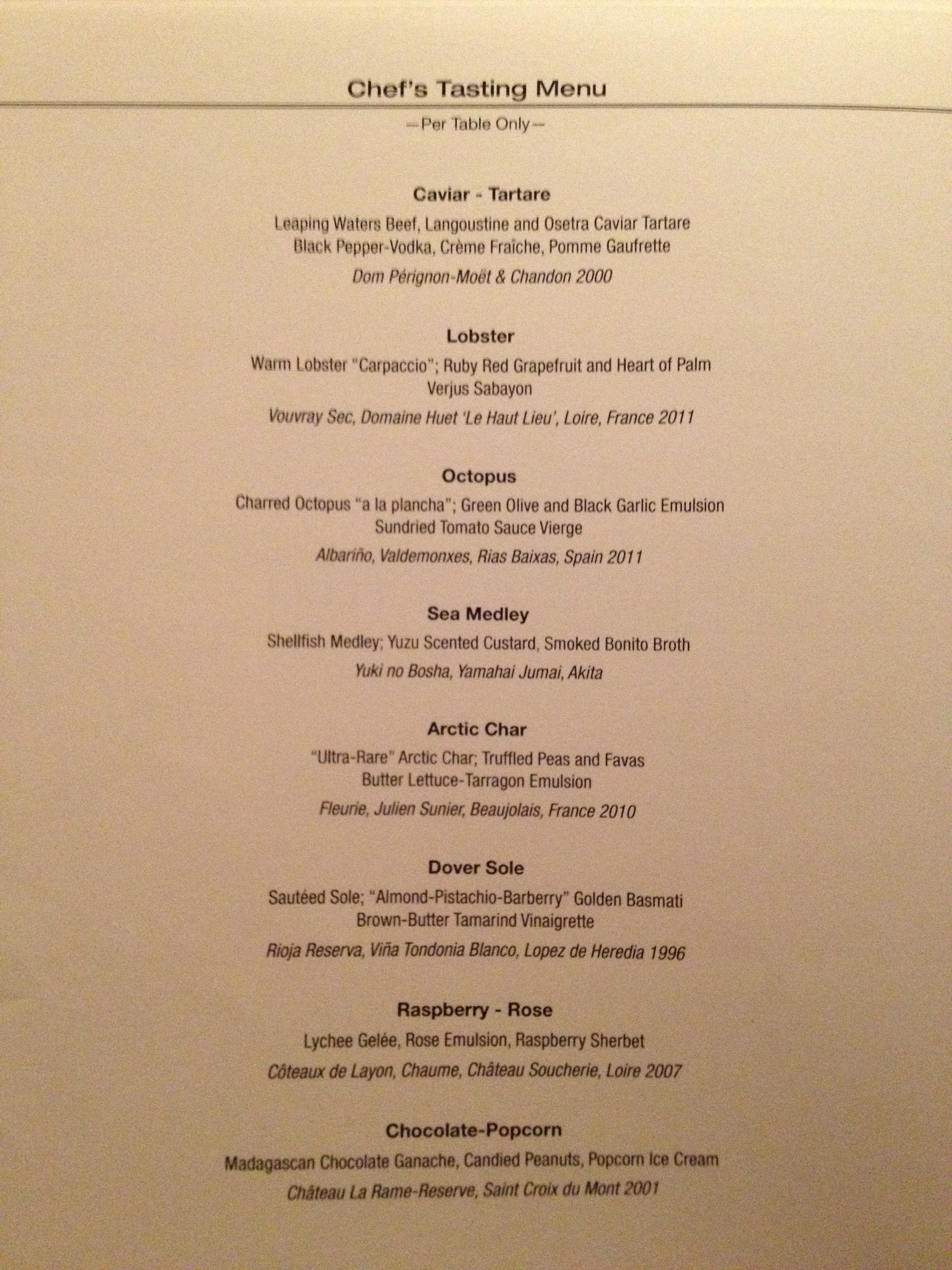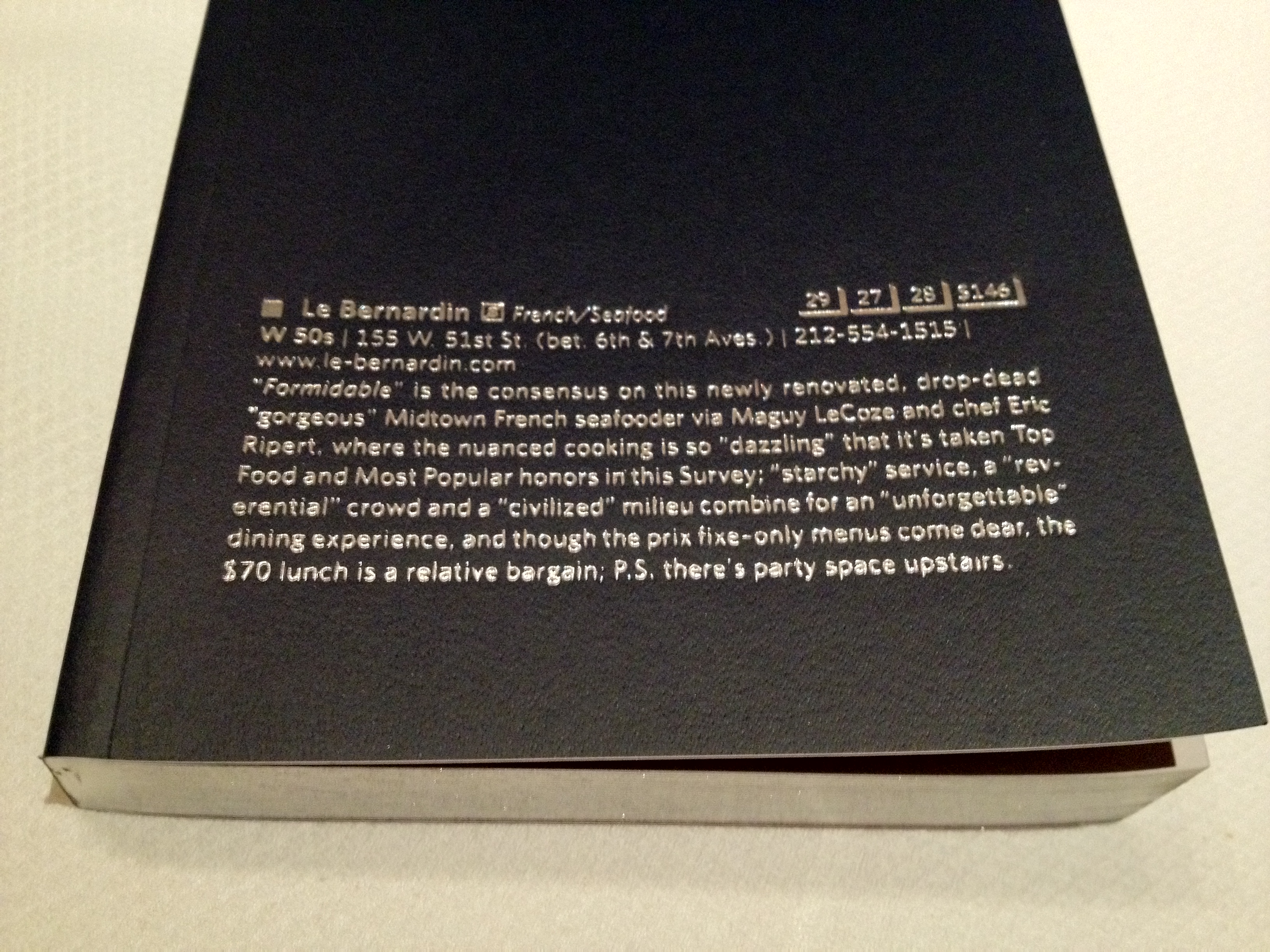 They gave us a free Zagat Guide to go with the menu! This was a “Le Bernardin” edition, so that was kind of cool. Too bad the 2013 one’s already out :(.