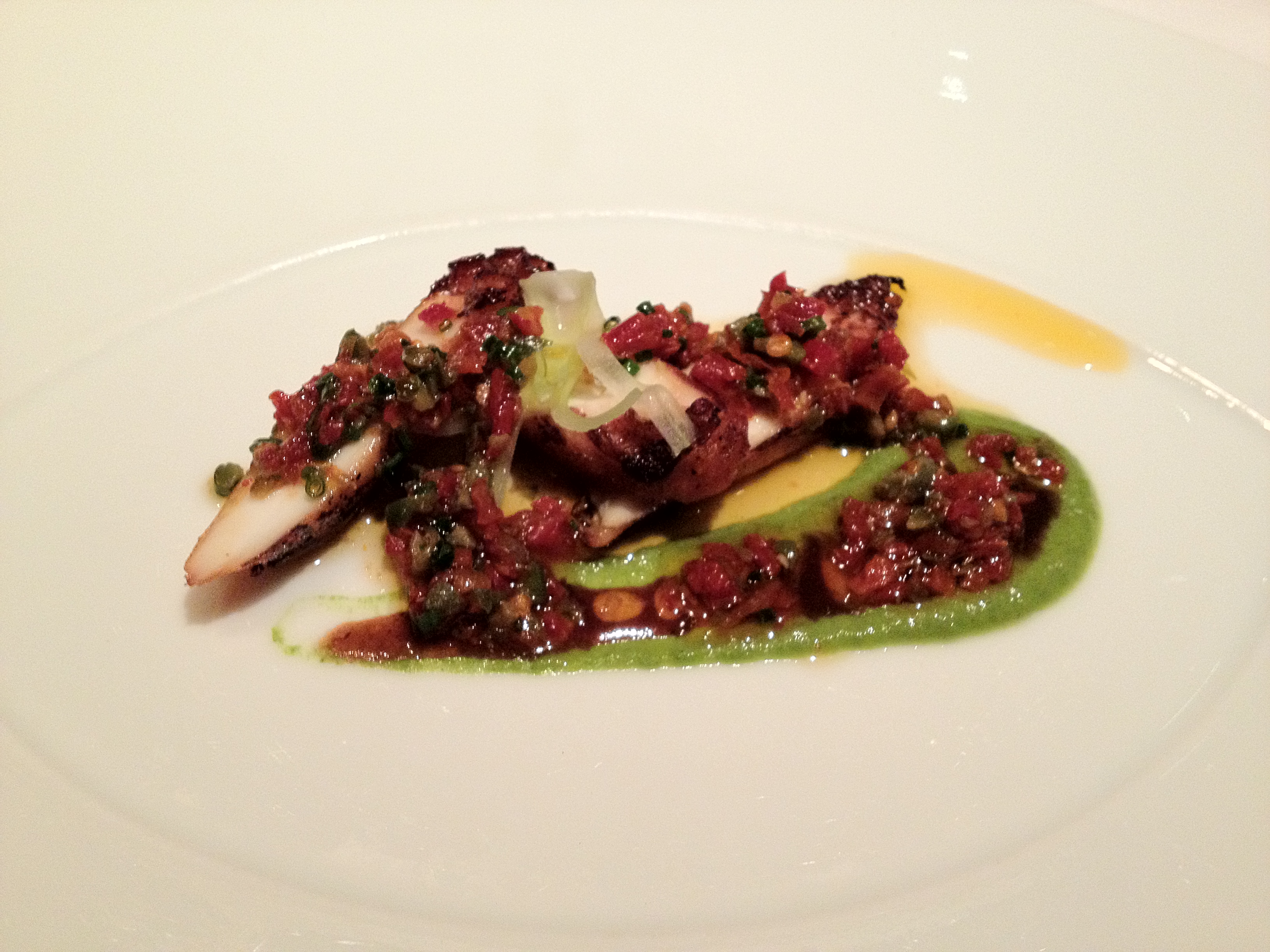 The octopus was sourced from Spain. The emulsion had green-olive mousseline on the outside and a purée of black garlic and squid ink on the inside.