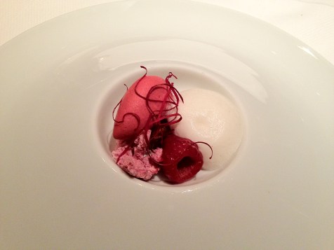 I liked the interaction of all the different textures in this dish. The rose emulsion and raspberry sherbet were really soft and light, the lychee gelée and rose emulsion were still soft yet also a bit harder, and the freeze-dried raspberry pieces and raspberry cake added crispier, hardier textures that were still refreshing. No one ingredient overpowered the other.