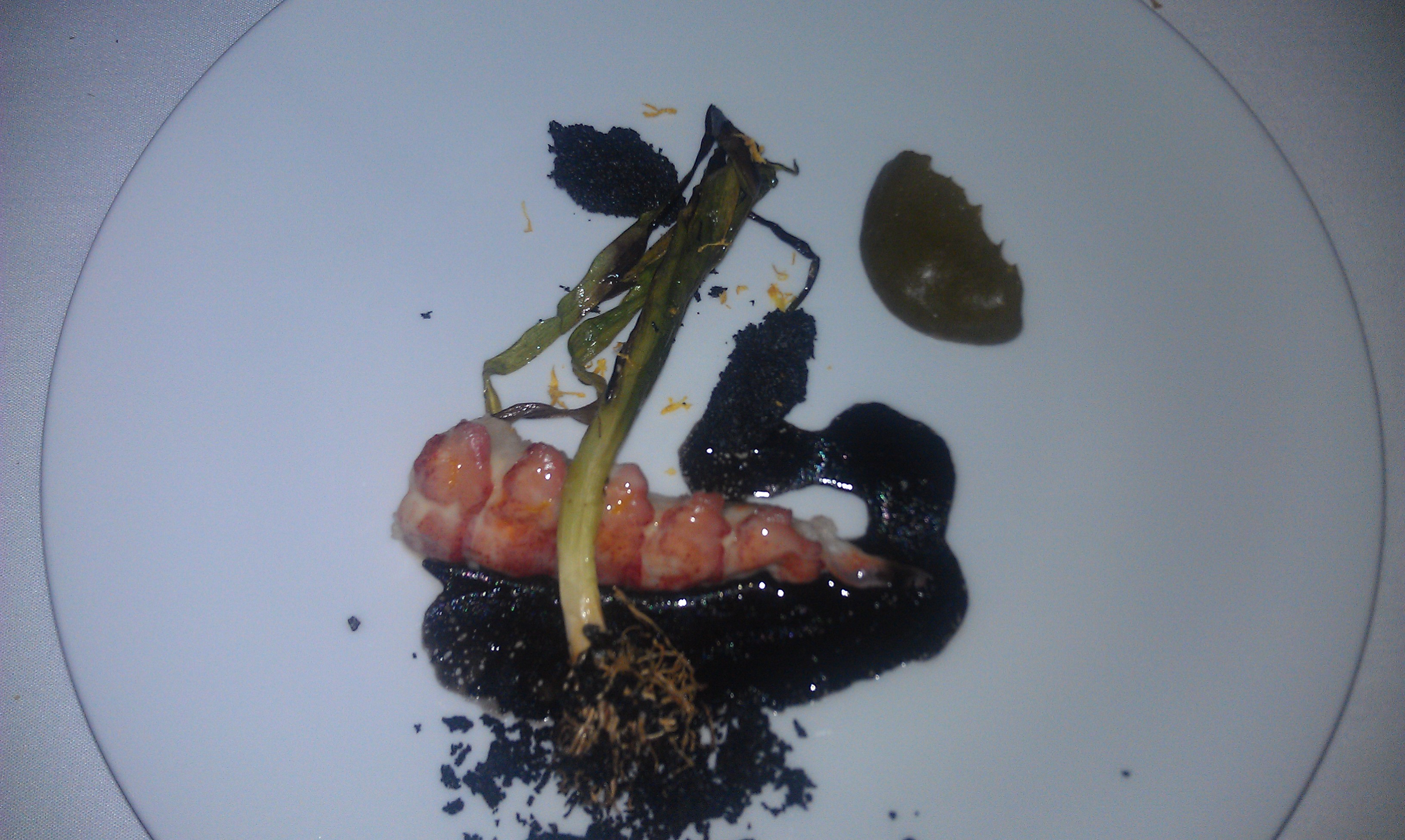 Lobster! Poached with meyer lemon, burnt leek, and shellfish bisque.