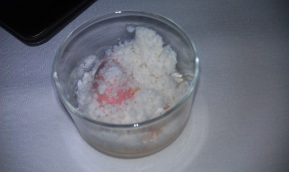 Monte: I love these lollipops. I remember EMP doing a beet-goat-cheese lollipop that blew my socks off, and these curry-yogurt ones were no different. Chilled yogurt filling awaits the unsuspecting diner, who pops the savory curry-flavored lollipop in like any other dumdum or creamsicle. It is whimsically like a popsicle, especially on a warm summer day (as it was when we ate it), and yet an entirely different experience via its explosion of Indian flavors.