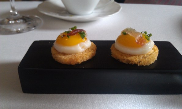 Quail egg with bacon on brioche!
