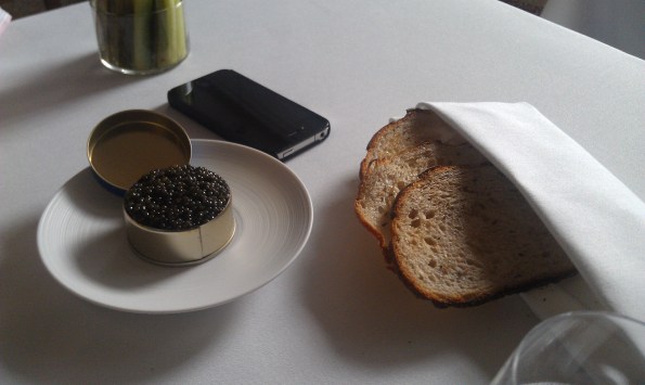 The caviar and bread, along with cucumbers and pickles in the back!
