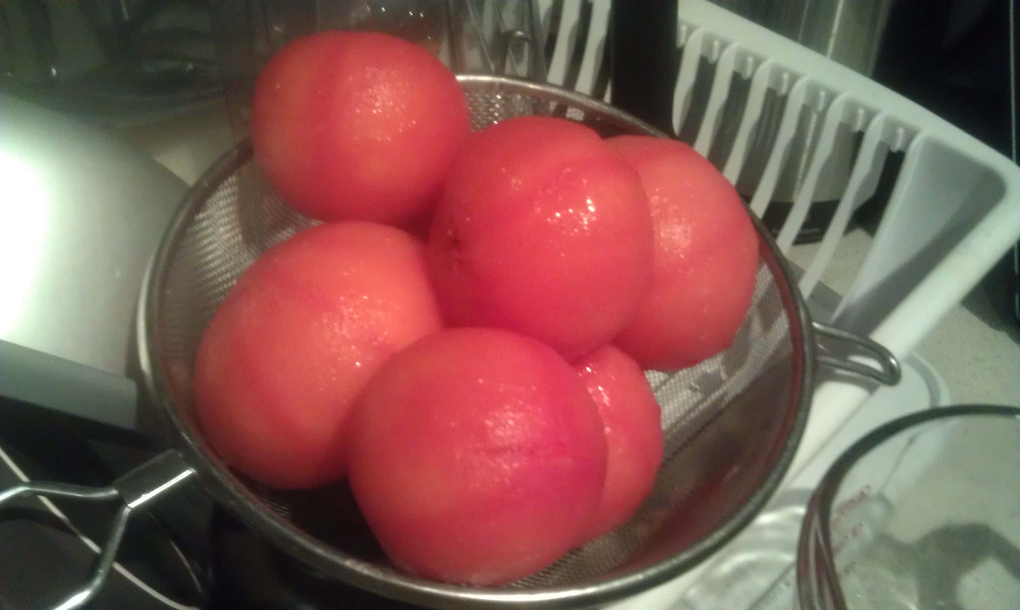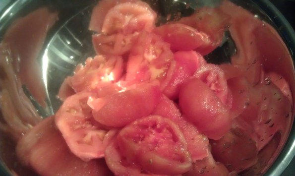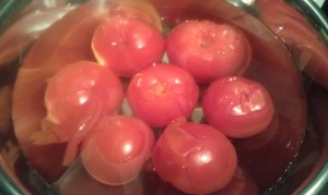 First off, I used vine-tomatoes rather than plum tomatoes – just because that was what I had. I scored the bottom with an x, took out the core, boiled them for 15 seconds and then dunked them into an ice bath before peeling the skin.