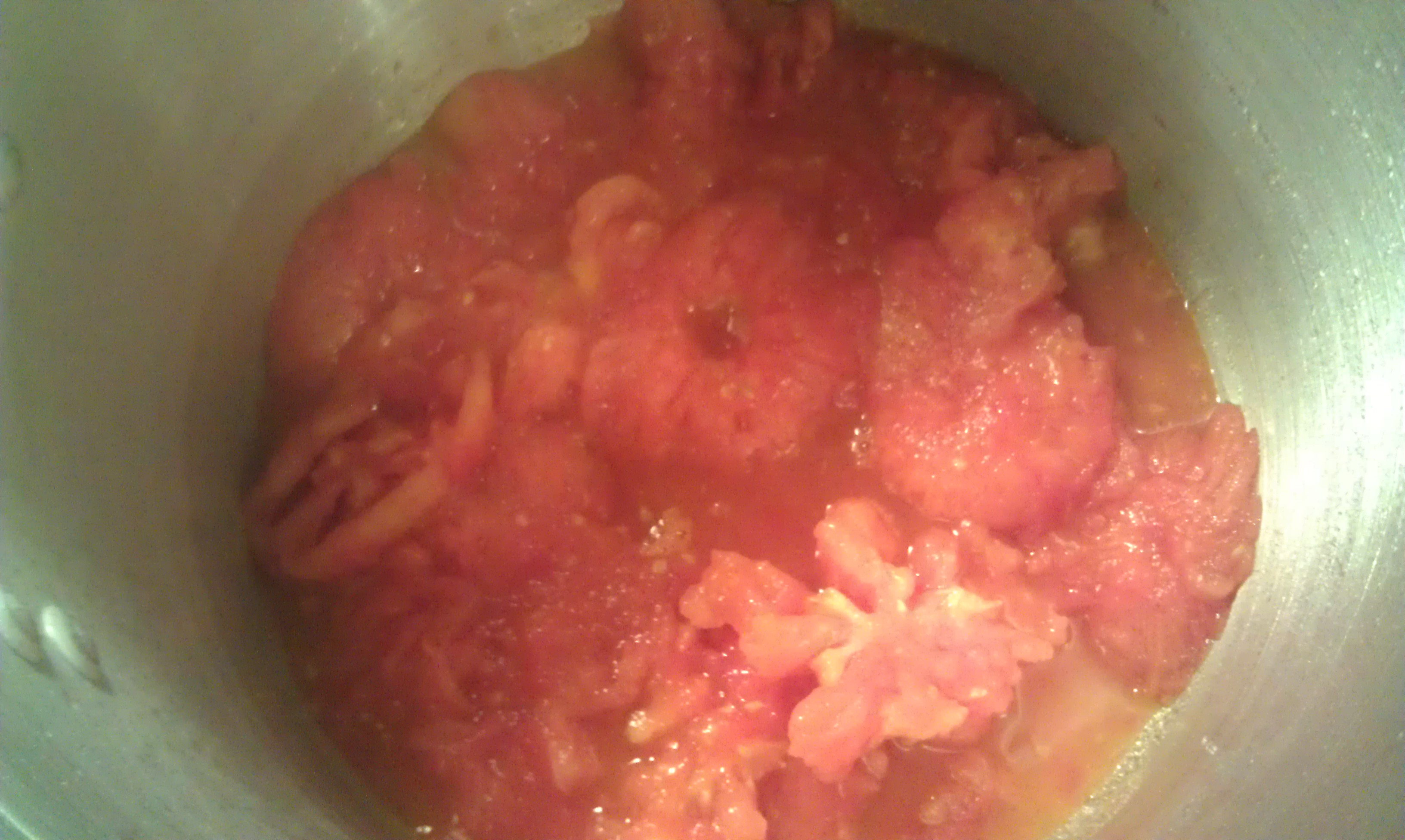 I then took my tomatoes, dumped them into a pot with a bit of olive oil and a pinch of salt. They simmered over medium heat for 45 minutes and I just used my potato masher to smash the tomatoes. That was fun to write. And to say outloud. Say it 6 times fast.