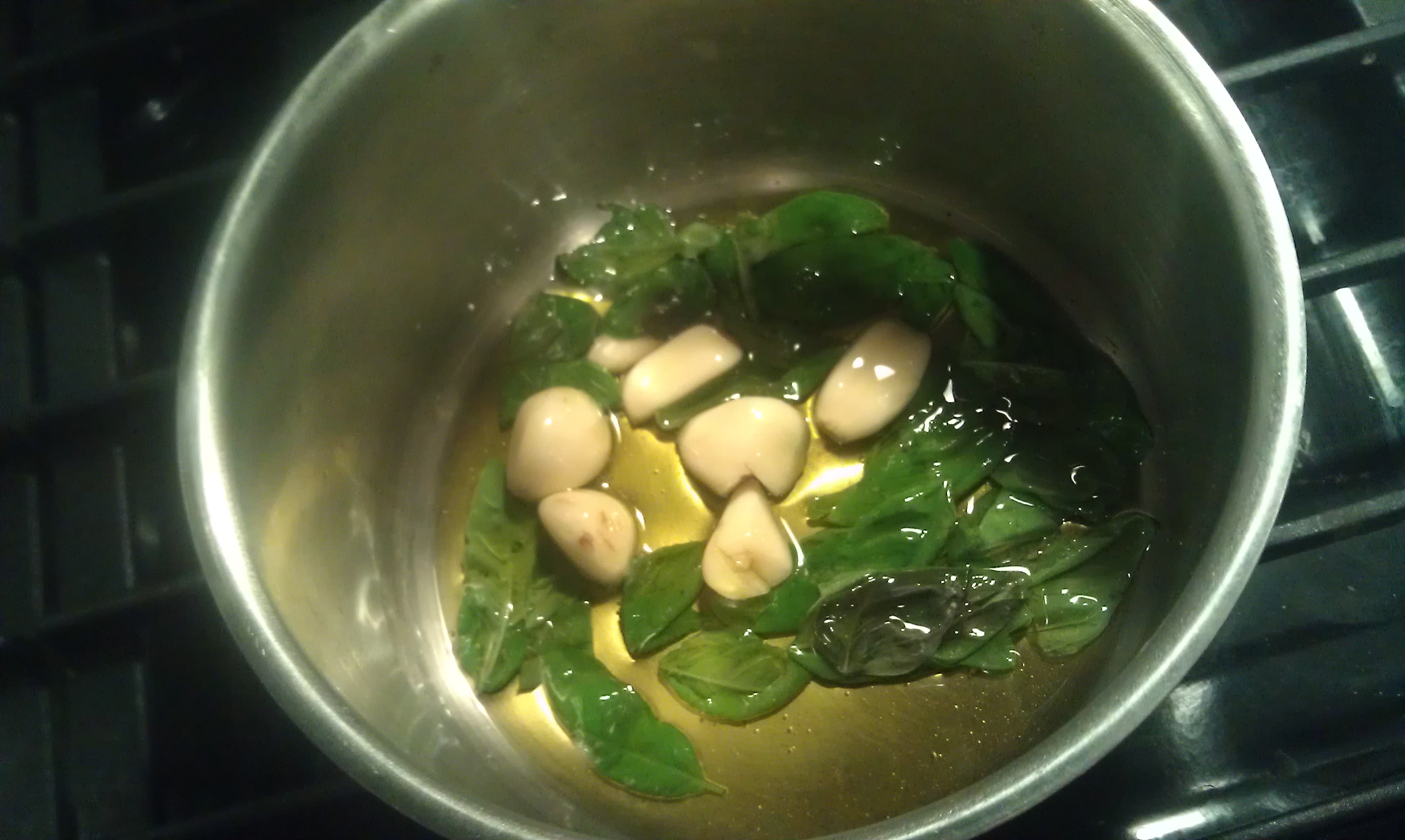 While the tomatoes were breaking down, I did start making the basil garlic olive oil to later add into the broken-down tomatoes. I just grabbed about two gigantic stalks worth of basil and a couple of cloves of garlic – I didn’t have italian chili flakes, but I just ended up adding cayenne to the final product.