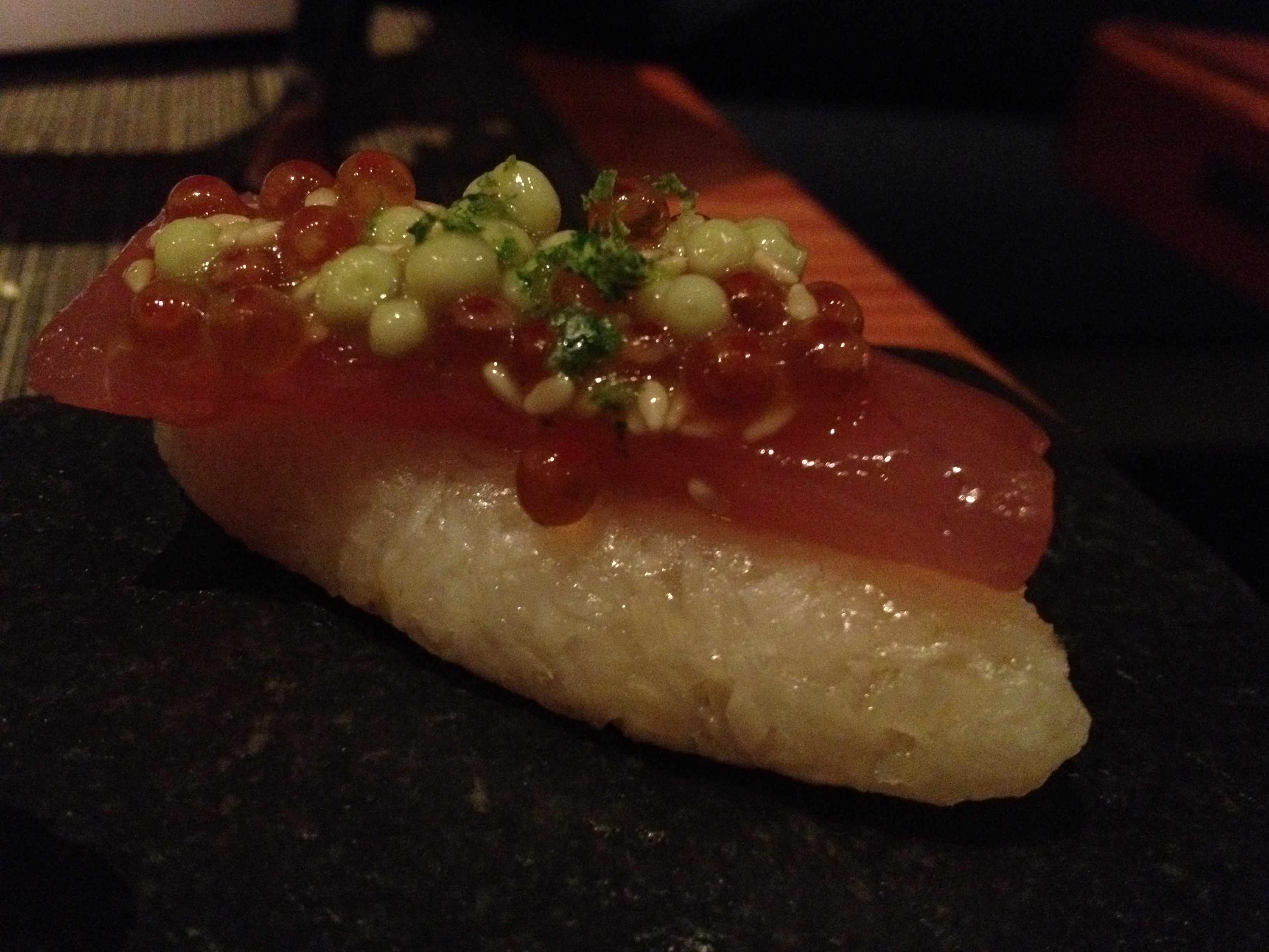 Monte: It tastes like a great piece of nigiri, but I knew the dish was more intricate than that. With more research on seriouseats, it turns out the orange pearls on top are trout roe marinated in classic ponzu, and the green pearls are cream cheese pureed with seaweed and spherified with agar agar. This is really technical and creative cooking, and there’s real a sense of wonder as a diner who’s not familiar with these advanced techniques.