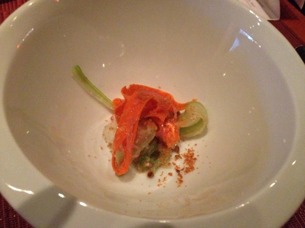 Monte: This dish was so light and fresh. I couldn’t really discern the different individual ingredients, but I got a pleasant play on acid and sweetness. I couldn’t tell what the orange ribbons were, I thought they were carrots cooked in a seafood-flavored bath, but turns out they were lobster roll noodles!