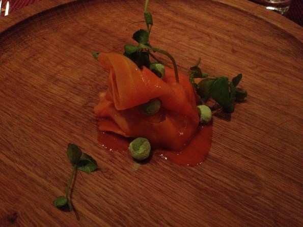 Monte: It’s a great play on peas and carrots. The paper thin ribbons of carrots were tender and sweet, whilst the “peas” were carrot balls covered in pea dust. Of course, everything was enriched by the creamy yolk, which is apparently a duck egg yolk cured for 6 hours in a salt, sugar, and amaro bath. There’s also a confit of chicken at the bottom. It’s a really complicated but fun dish.