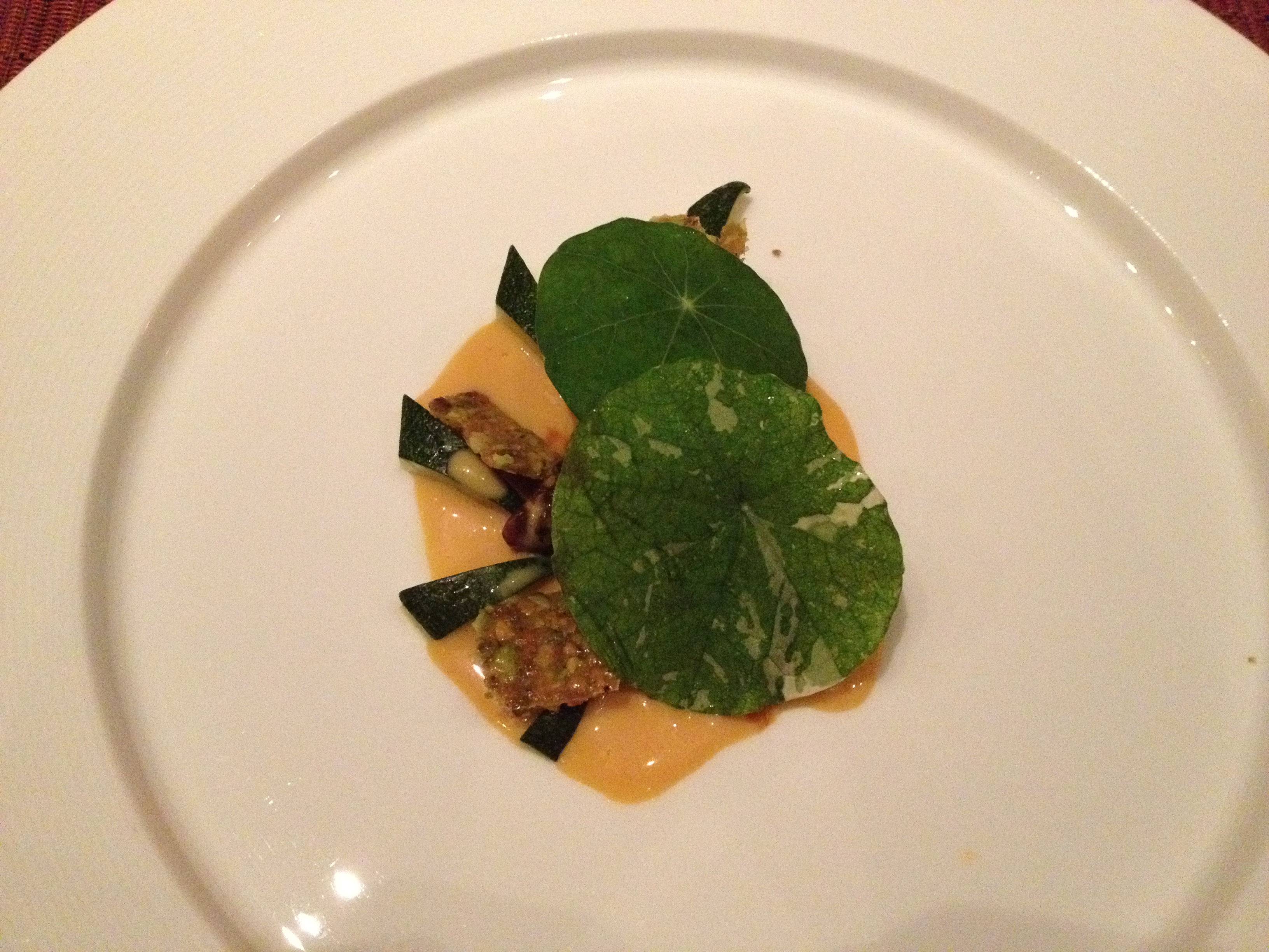 Monte: The zuchinni leaves hide the beautiful sweet pistachio crust that paired oh so well with the savory sweetbreads.