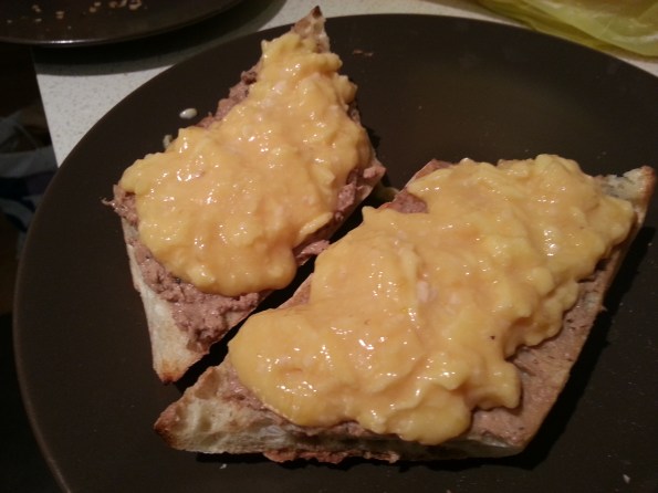 While the eggs continued to cook, I took a brief break from stirring to spread the baguettes with a thin layer of the chicken liver/turkey mousse. It had a very strong rich aroma, undoubtedly helped by the truffles in the mousse as well.