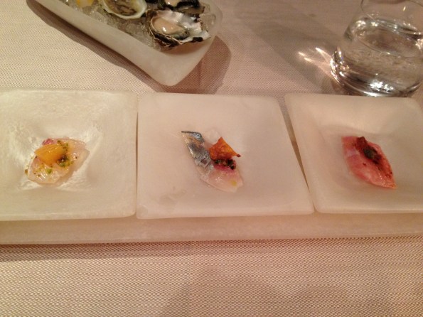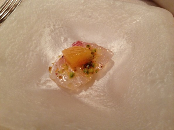 Monte: The lardo is incredibly delicate. It has all the flavors of pork fat plus something else – smokiness? It’s just so rich – not at all like the already-amazing bacon. The uni just adds onto the richness, with that extra added oceanic element. This amuse just melts your mind.