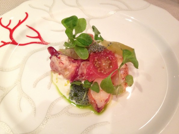Lobster salad with creamy burrata cheese and pickled eggplant.