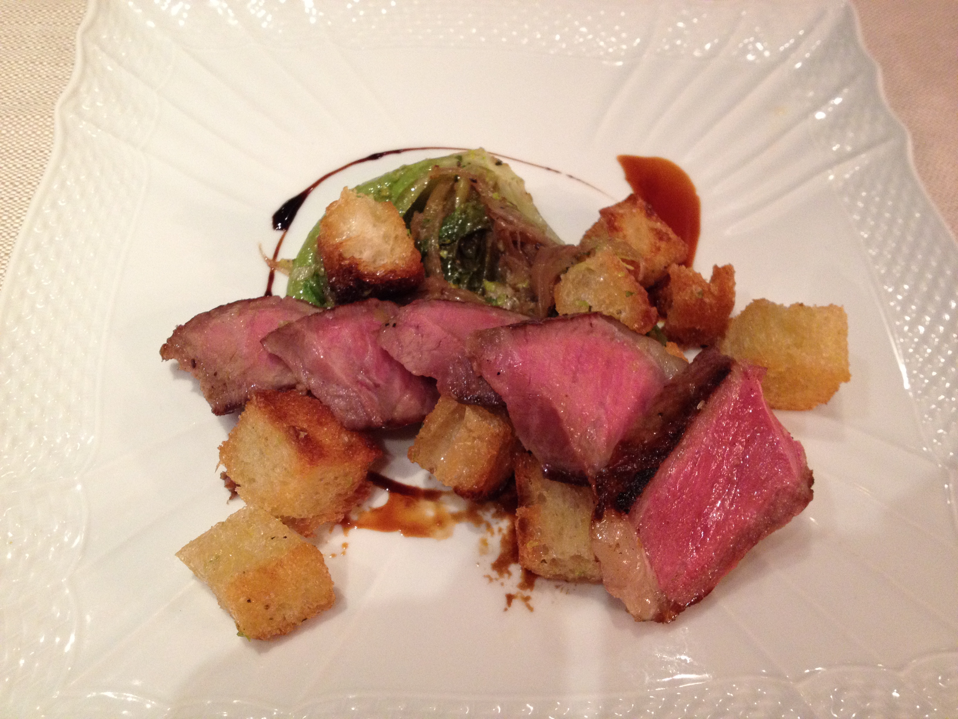 Seared sirloin steak with bone marrow, panzanella salad, and Romaine lettuce.