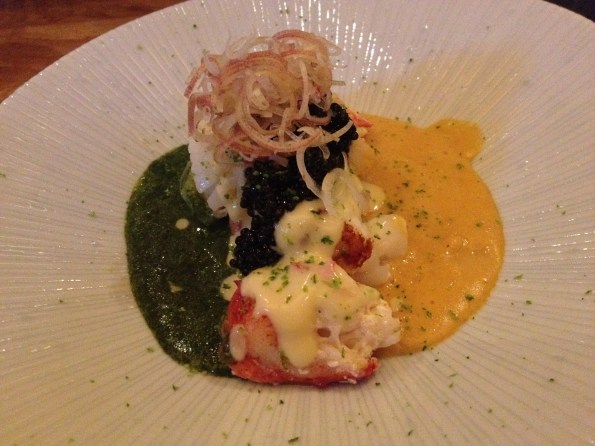 Maine Lobster Tail with Uni Sauce, Caviar, Yuzu Miso Cream (left), and Chrysanthemum Purée (right).