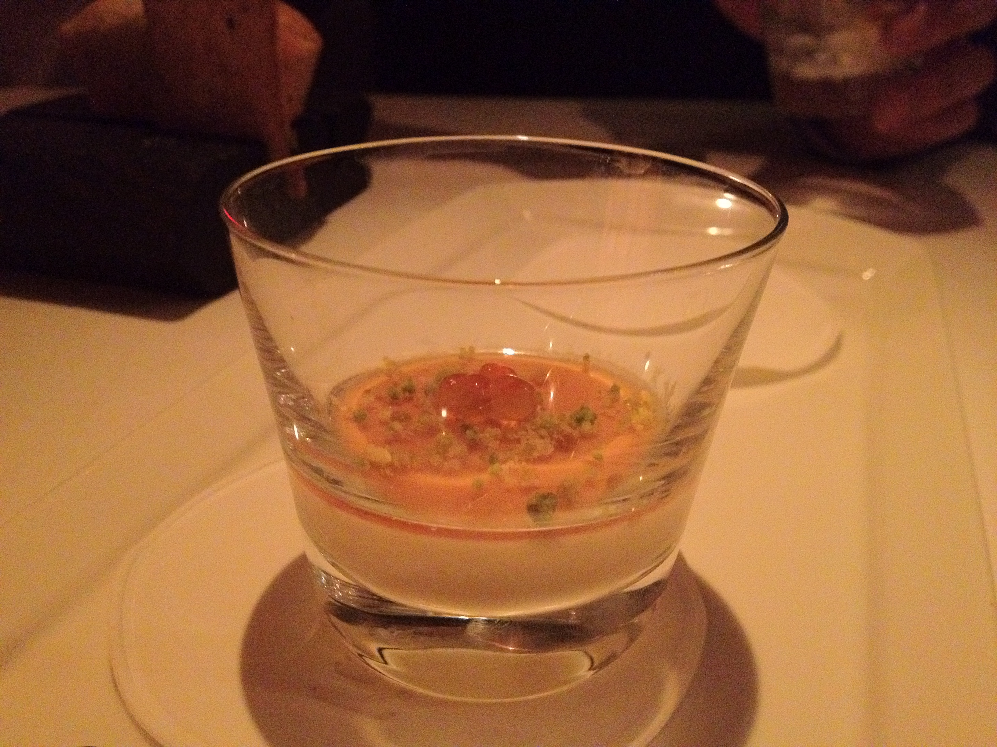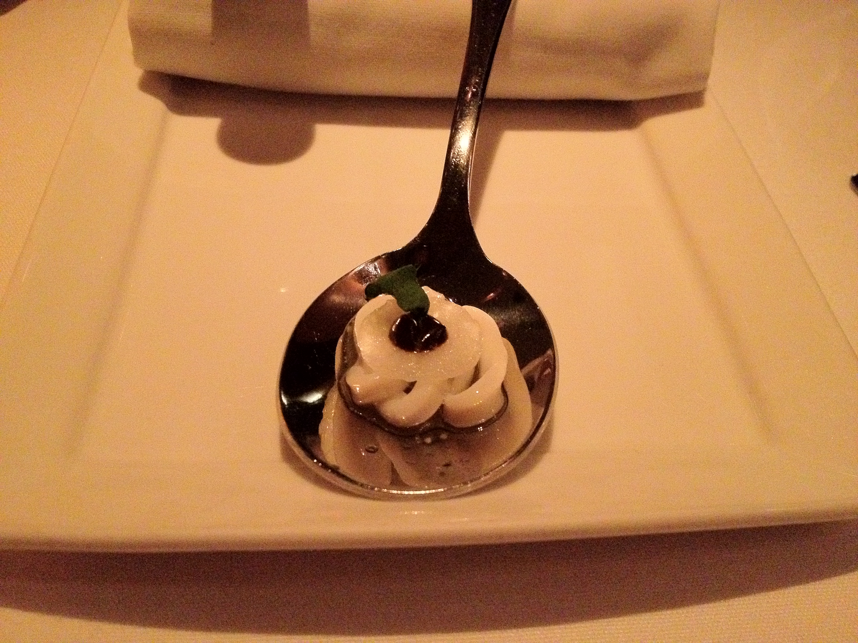 Monte: Unlike the first amuse where I thought the interplays between the crunchy creamy nutty sweet fruity tartness was all wonderful, this one went over my head without being that enjoyable. The squid noodles were tender enough, but I didn’t think the apple added anything.