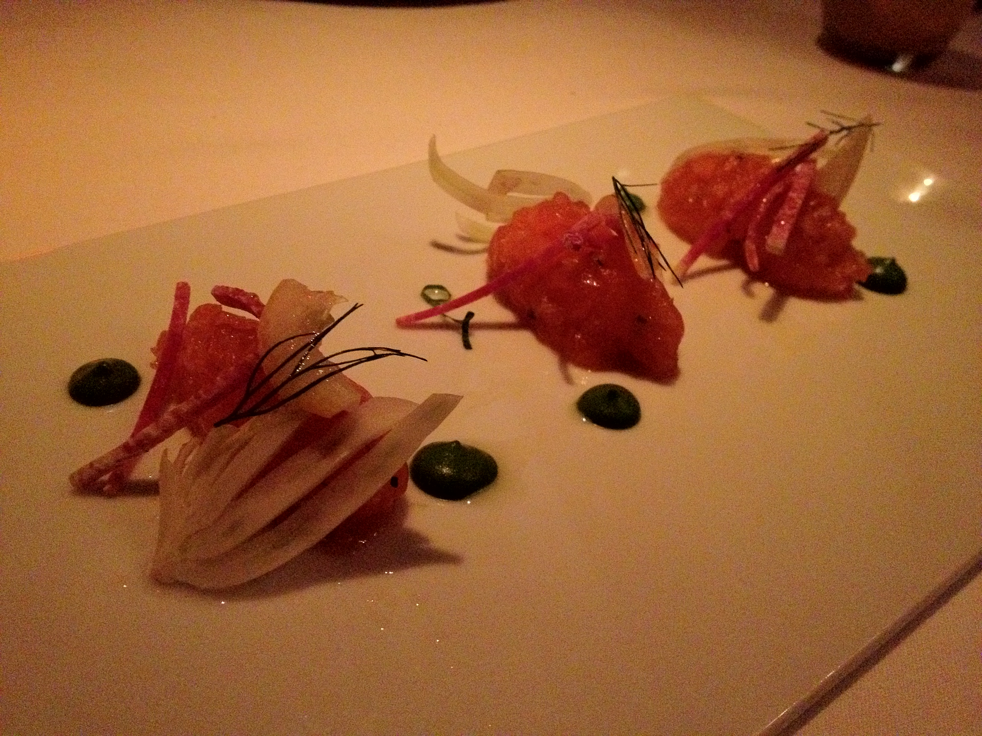 Salmon tartare, fennel, meyer lemon, and jalapeño.