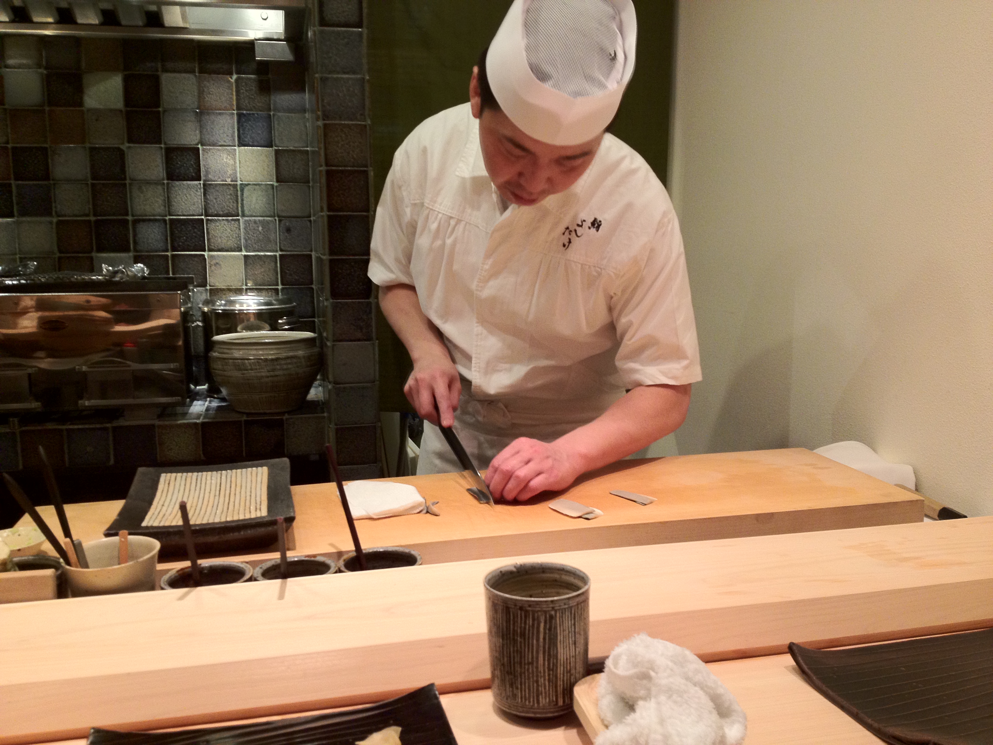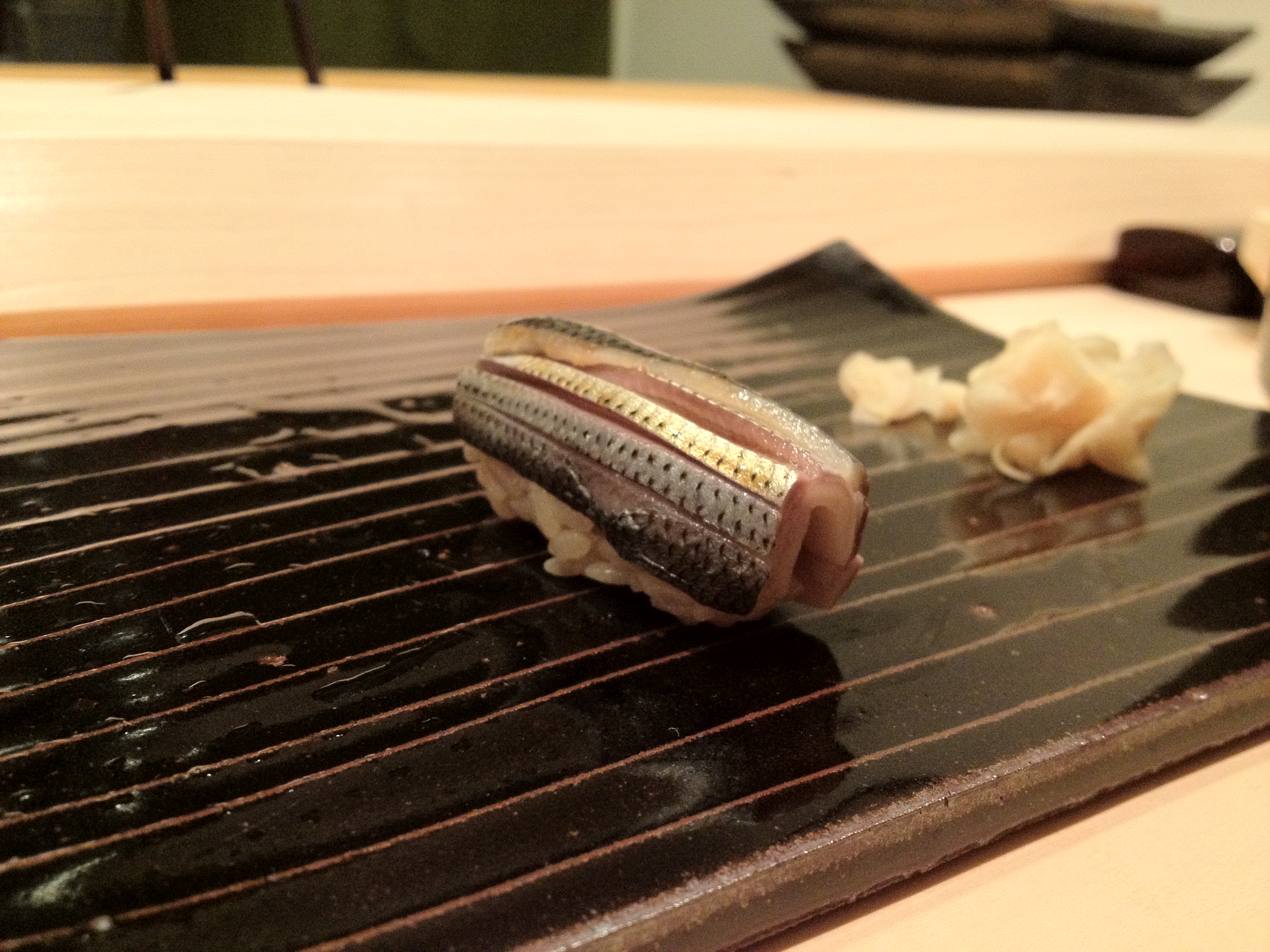 Chef Kakinuma is preparing the next sushi piece (kohada / gizzard shad) here: