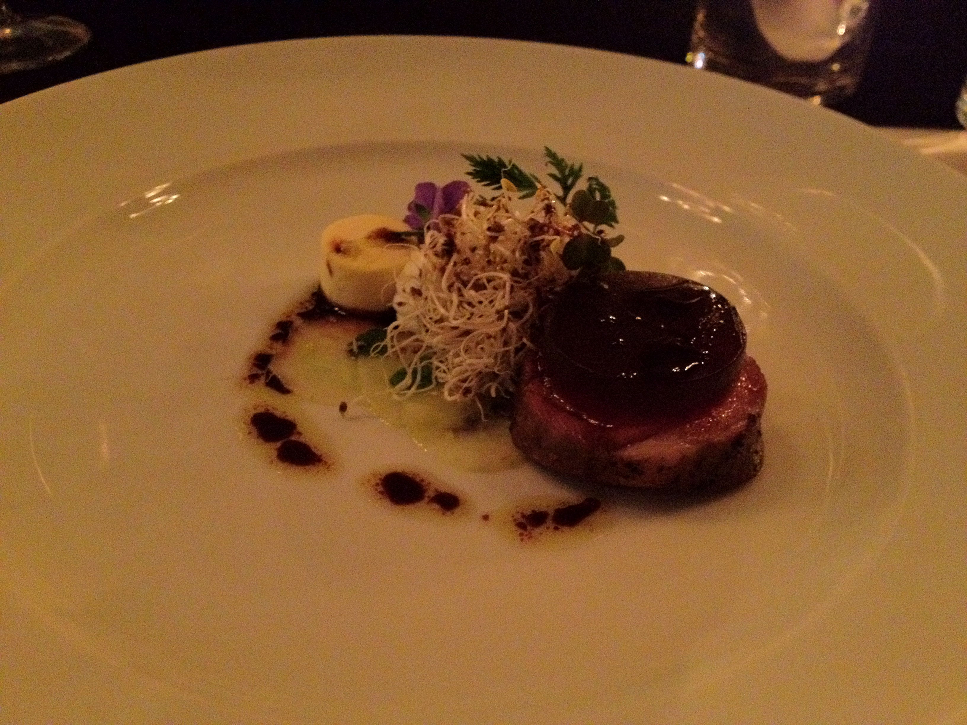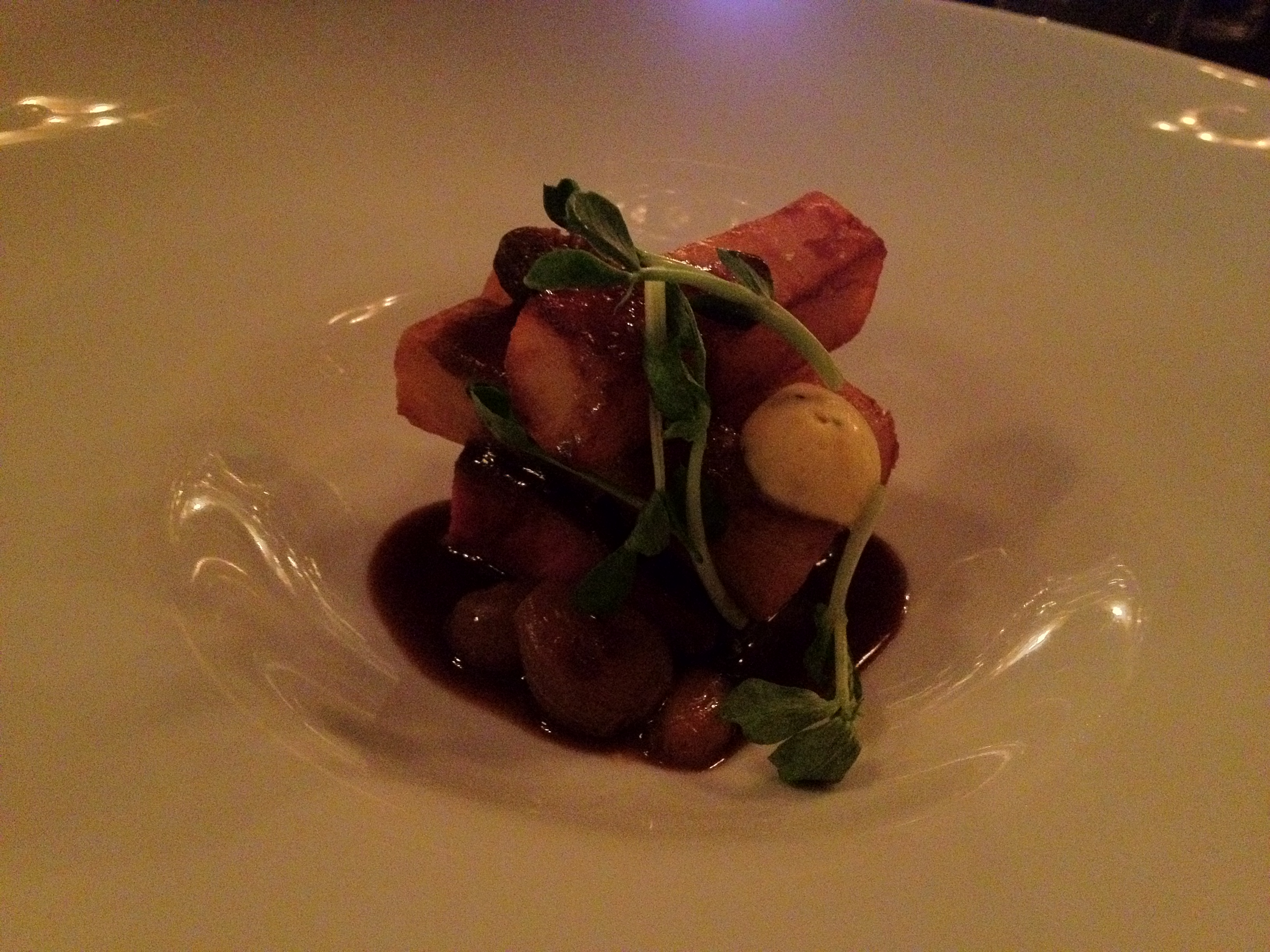 Sous vide pigeon with Japanese pumpkin purée, port-braised prunes, and apple foam.