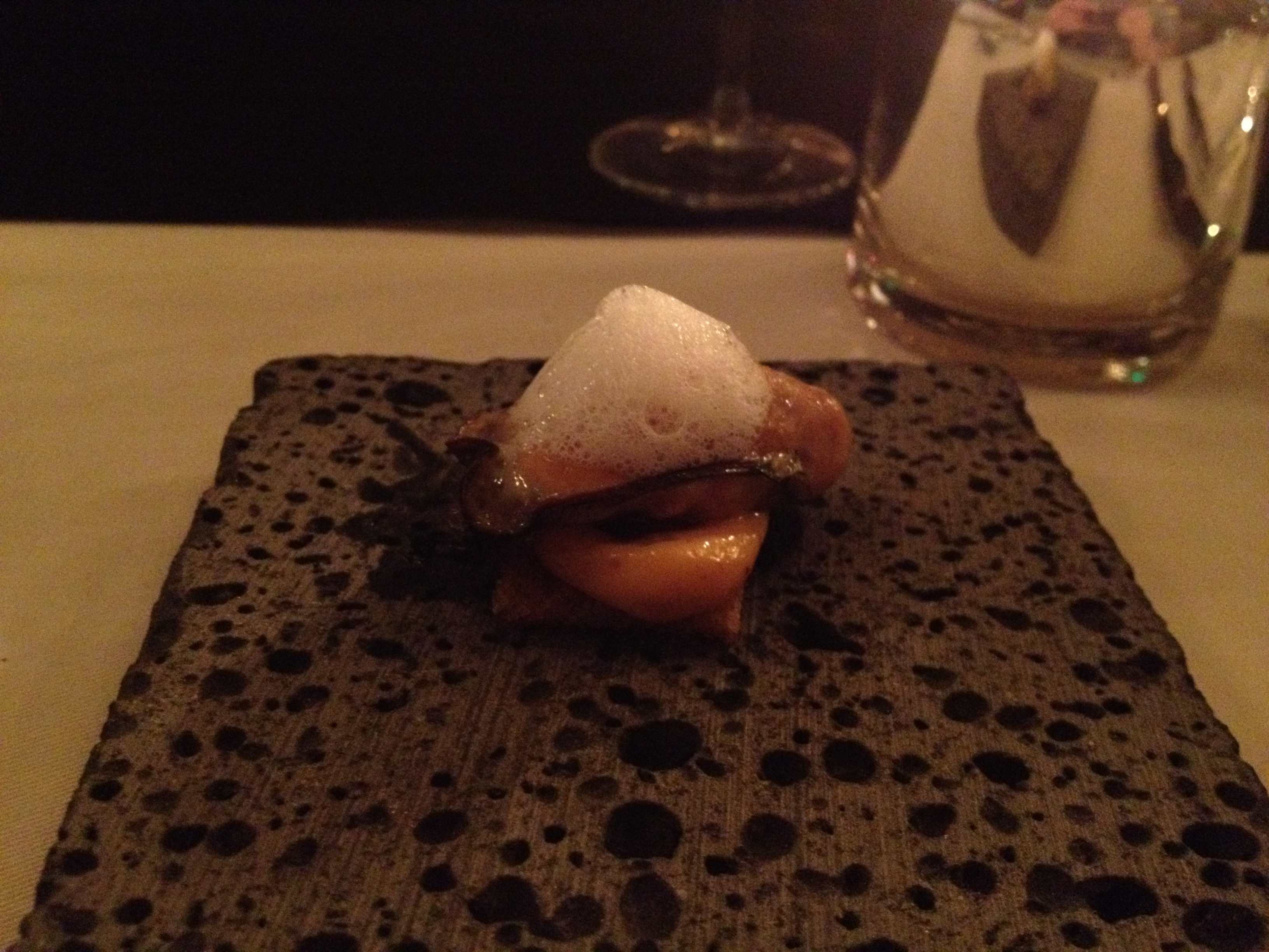 Smoked Fine de Claire oyster over toasted sourdough bread and mayo. With bacon foam.