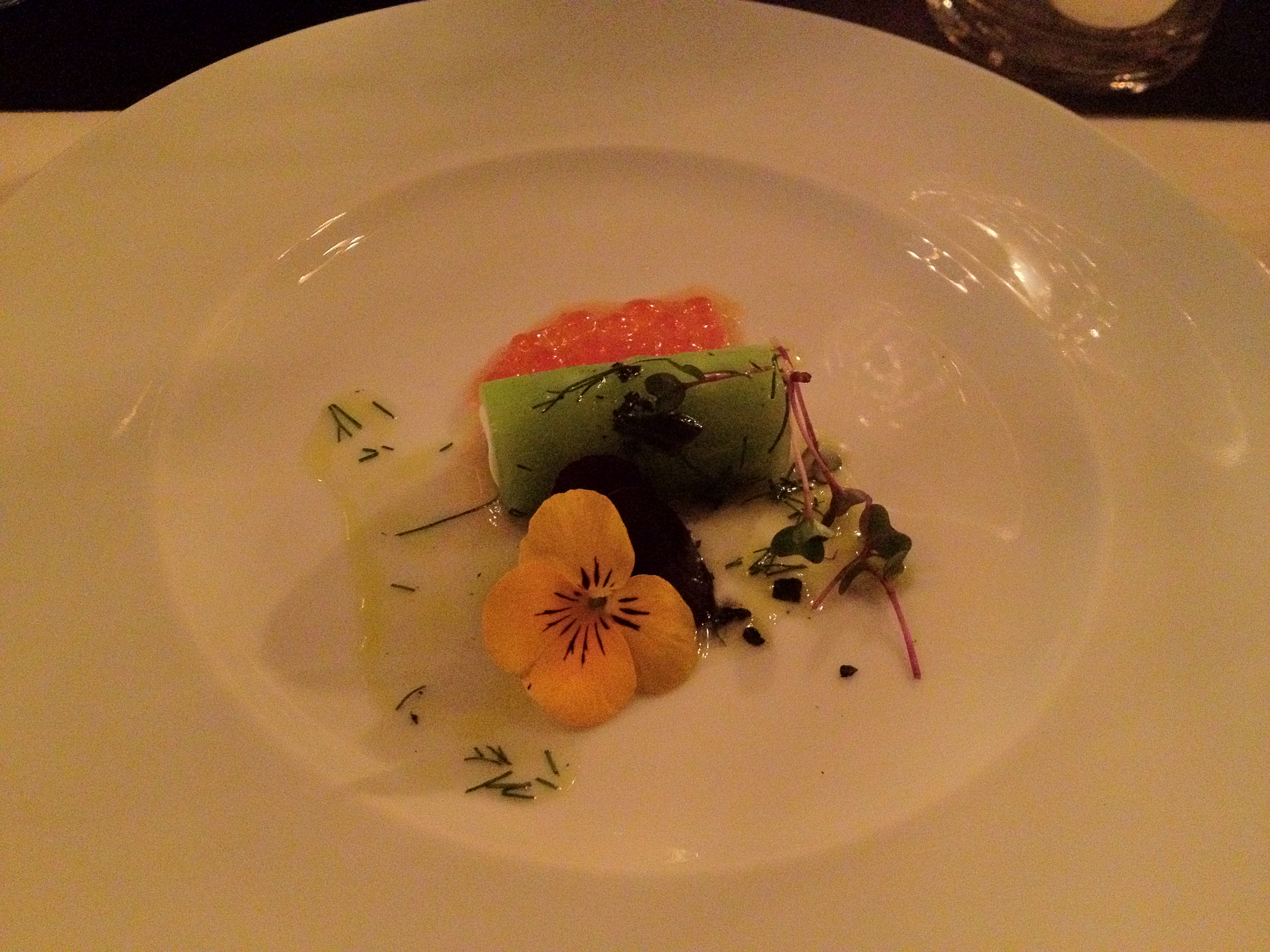Cod parfait, celery jelly, lemon and dill vinegar, and Keta (salmon) caviar.