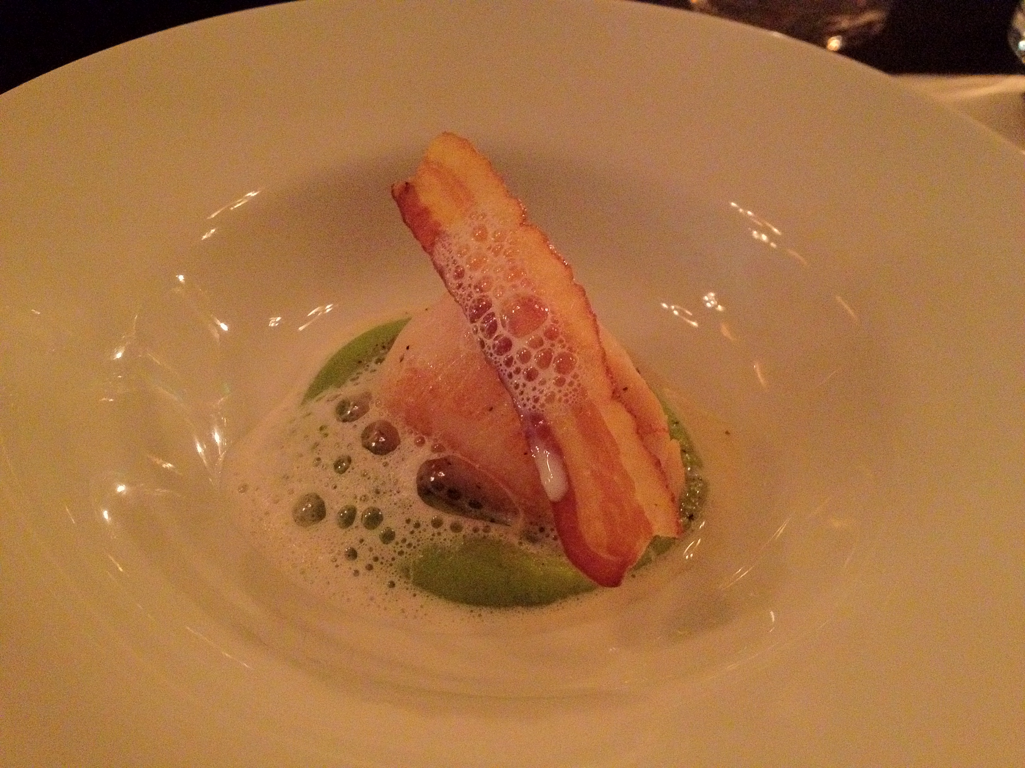 Dalian scallop with feva, pancetta, and mint.