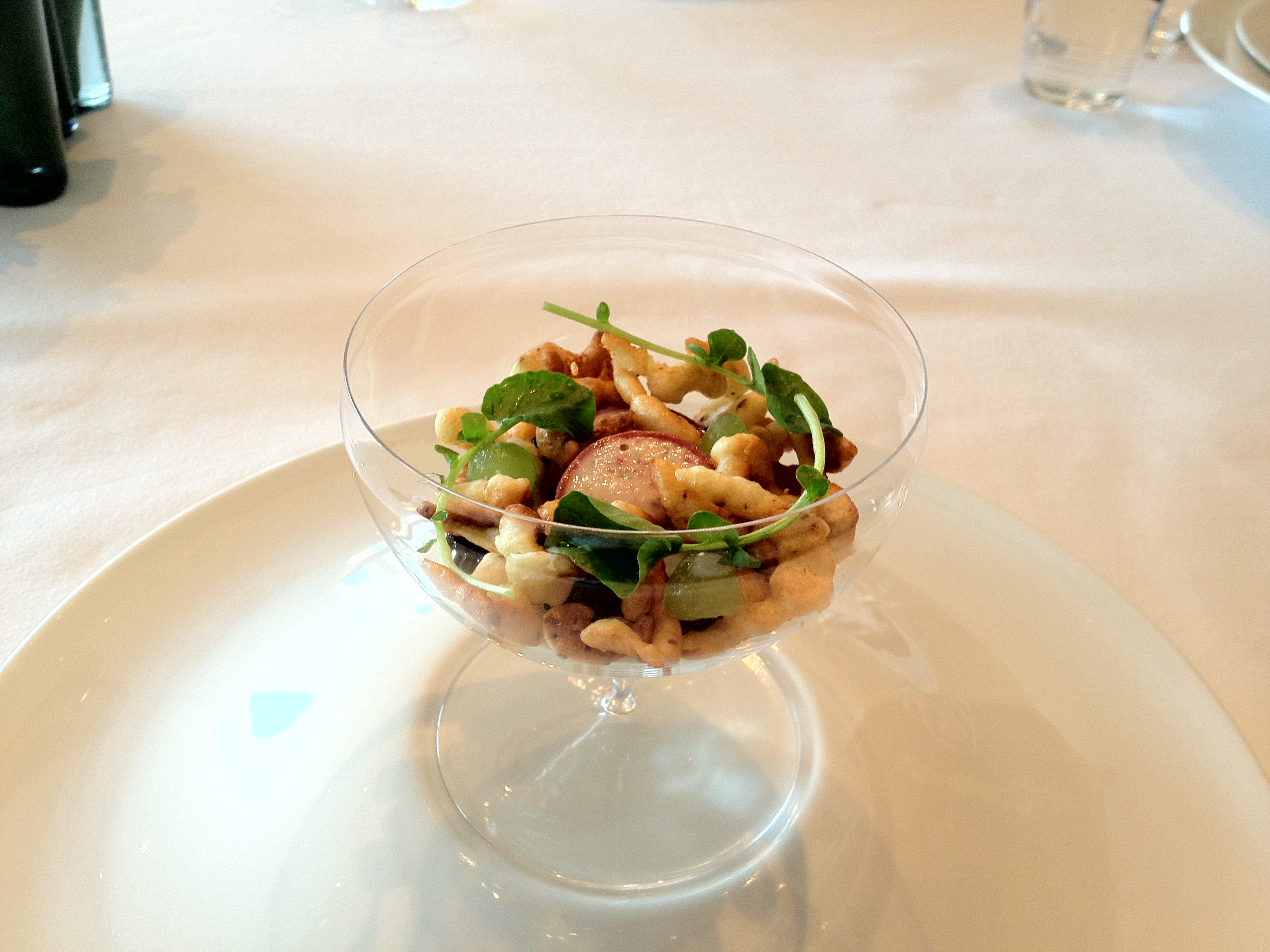 This caviar dish had two forms of meat: veal heart and sole; they were combined together to form the cylinder. This dish felt really complex. The spätzle, heart and sole, horseradish royale, and caviar all contributed to the dish, which was greater than the sum of its parts.